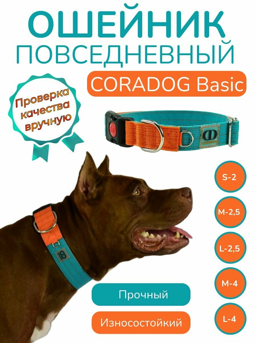 Ошейник повседневный, CORADOG Basic, для средних и крупных собак, бирюзовый оранжевый, размер L 42-65 см