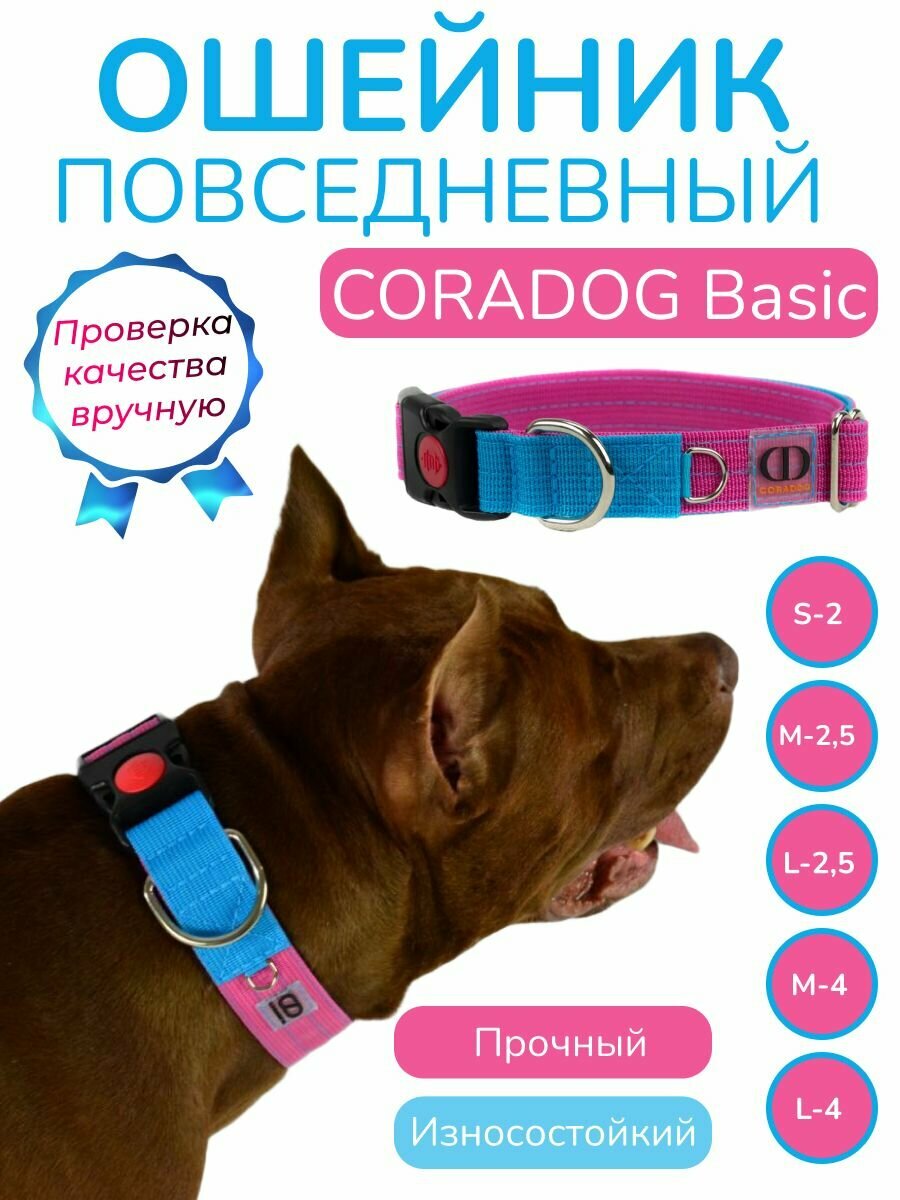 Ошейник повседневный, CORADOG Basic, для средних и крупных собак, голубой ярко розовый, размер M 35-46 см
