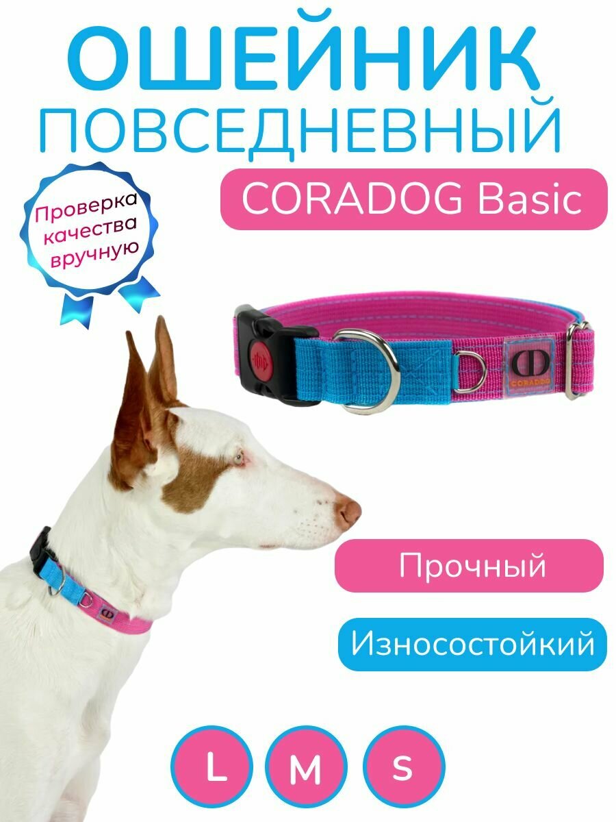 Ошейник повседневный, CORADOG Basic, для средних и крупных собак, голубой ярко розовый, размер L 42-65 см