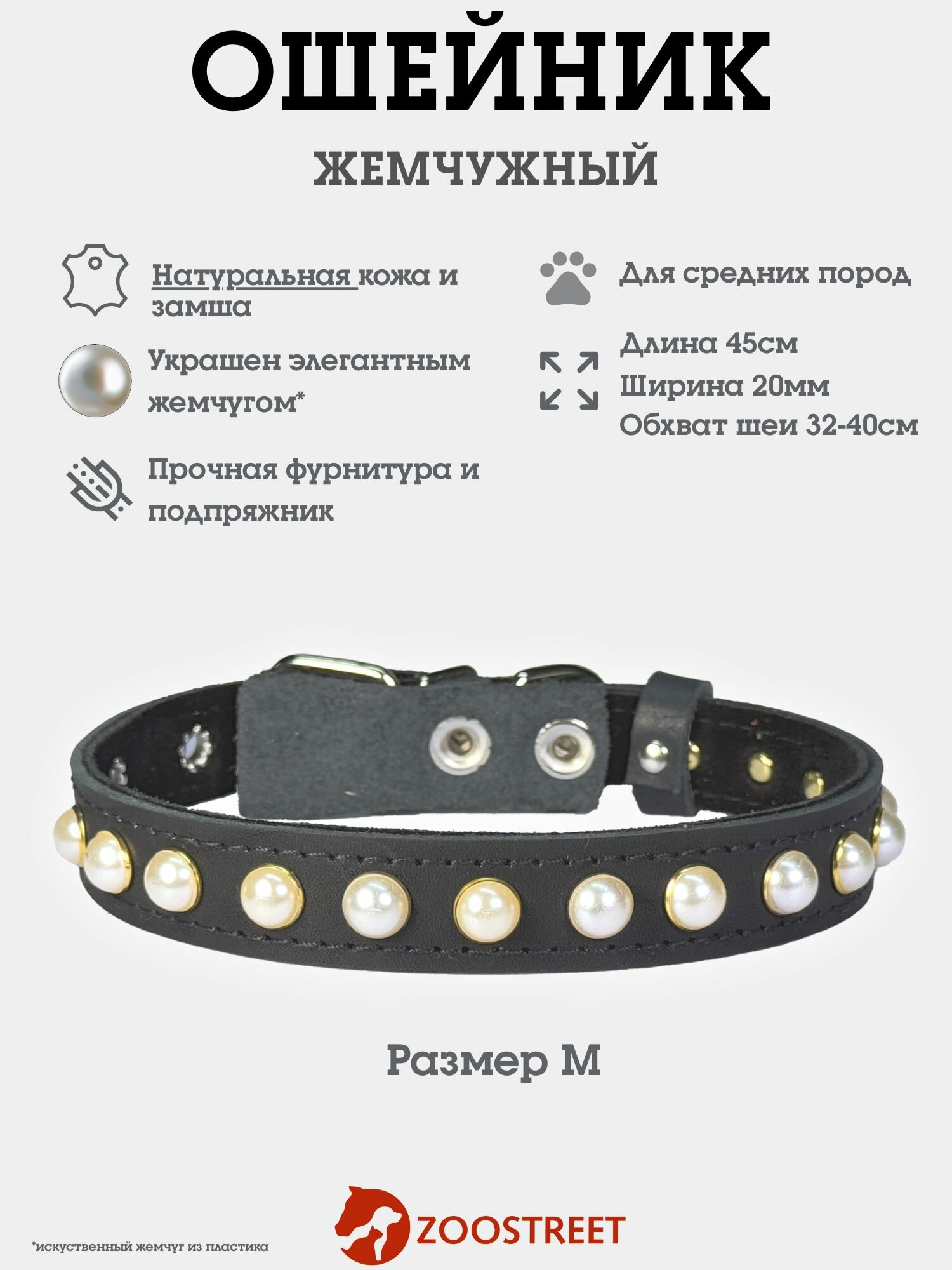 Ошейник для собак мелких пород кожаный, с жемчугом и подкладом из натуральной замши 20мм, 45см, с подпряжником М интересное: