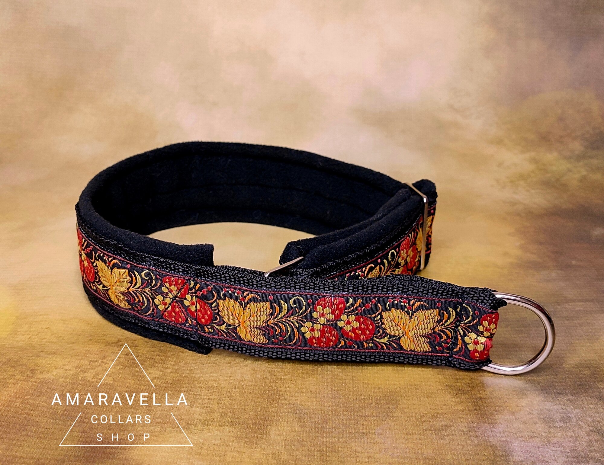 Черный с красным 4см широкий ошейник Хохлома S для собак полуудавка "Мартингейл" ручной работы