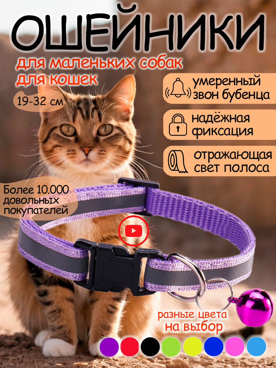 Купить Ошейник для кошек и собак светоотражающий с колокольчиком фиолетовый