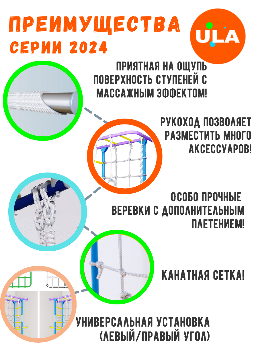 У угловой стойки крепёж к стене можно повернуть на смежную стену, что я и сделал. Красивое цветовое решение. Фиолетовый, синий, жёлтый. Дочь практически не слезает с него. |