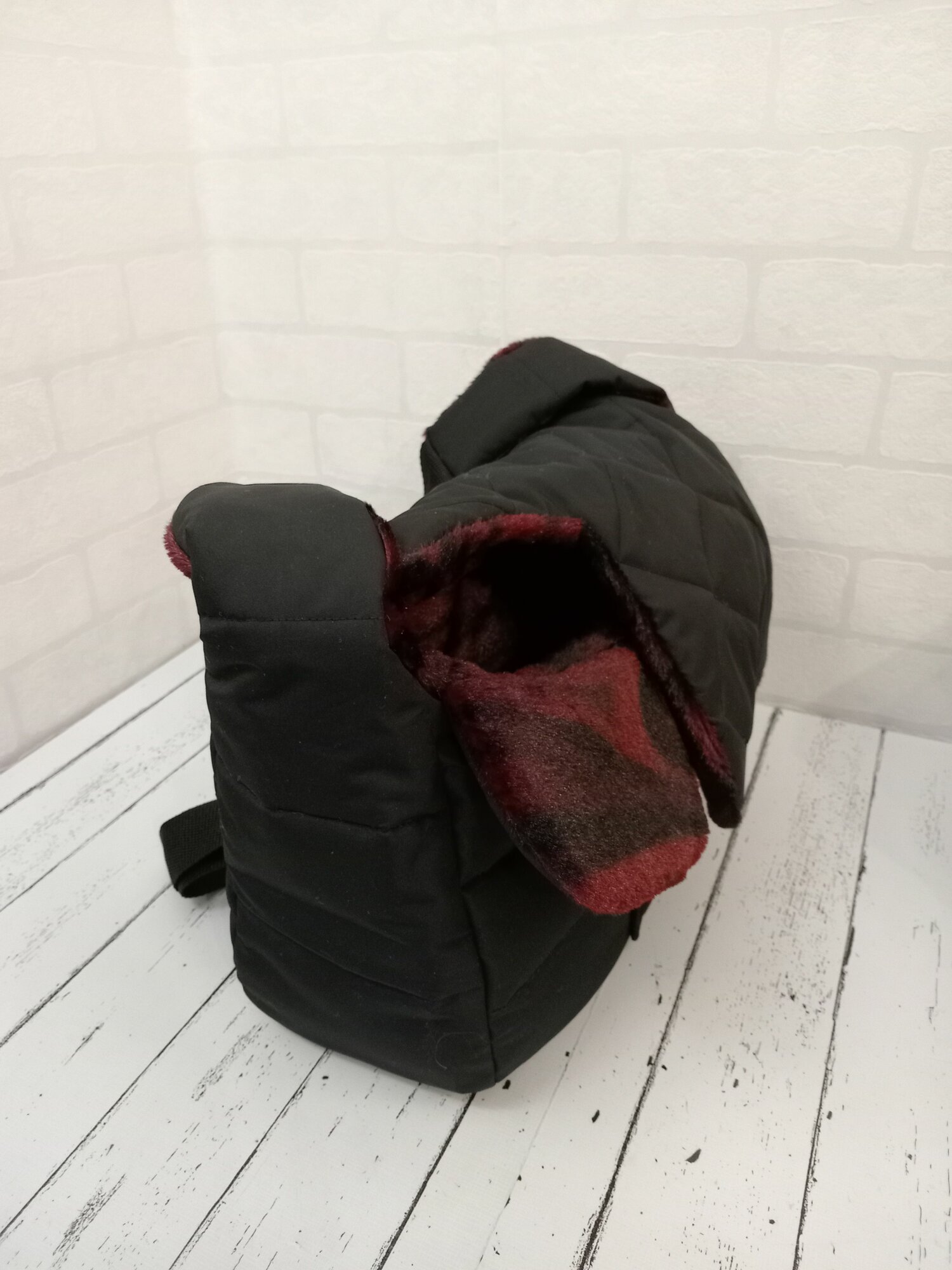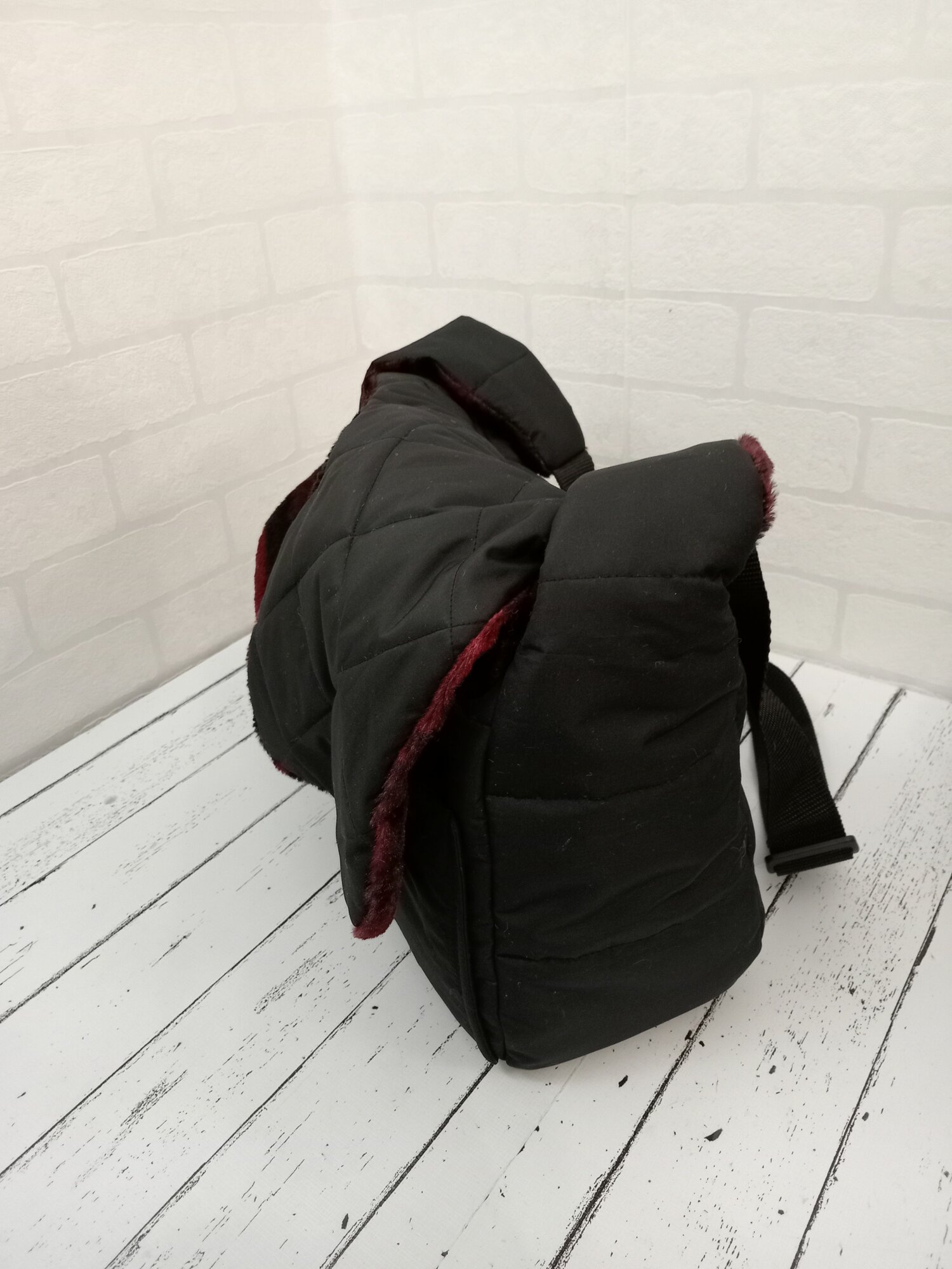 СохранитьЗимняя Сумка-переноска для собак 2-3,5 кг, размер S 32см Х 12см Х 20см, черная с бордовым мехом. На левое бедро, правое плечо интересное: