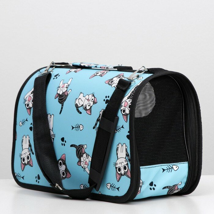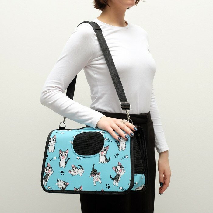 Купить Сумка-переноска каркасная "Играющие котики", размер S, 37,5 х 17 х 22 см, голубая