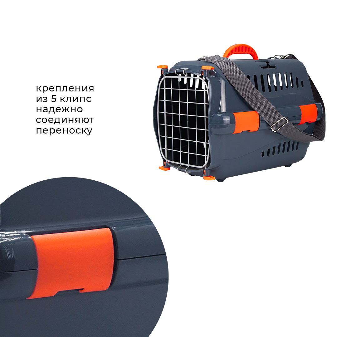 Пластиковая переноска для кошек и собак ZOOSET, 54,5х36х34 см, металлическая дверца и плечевой ремень, серый/оранжевый