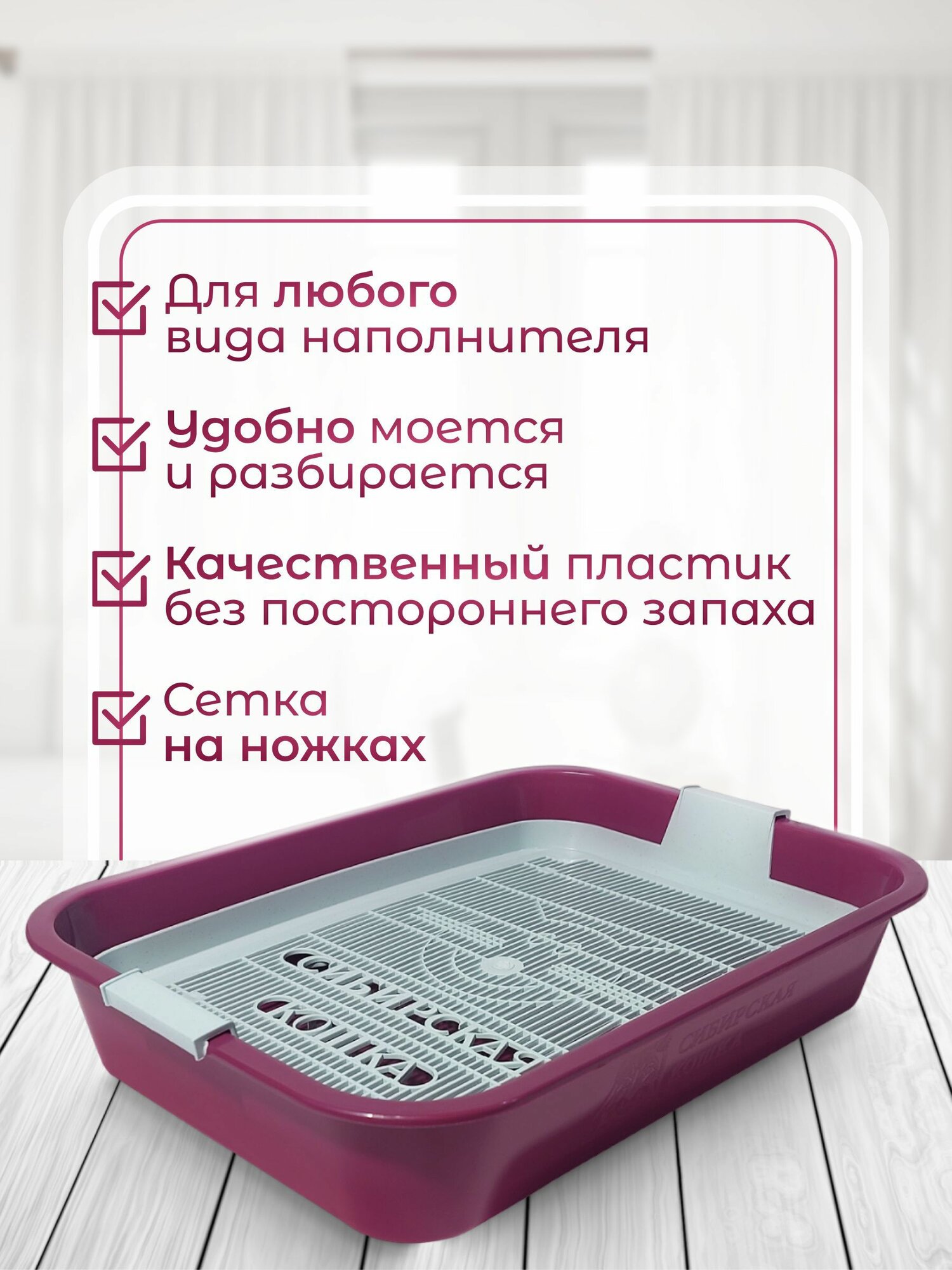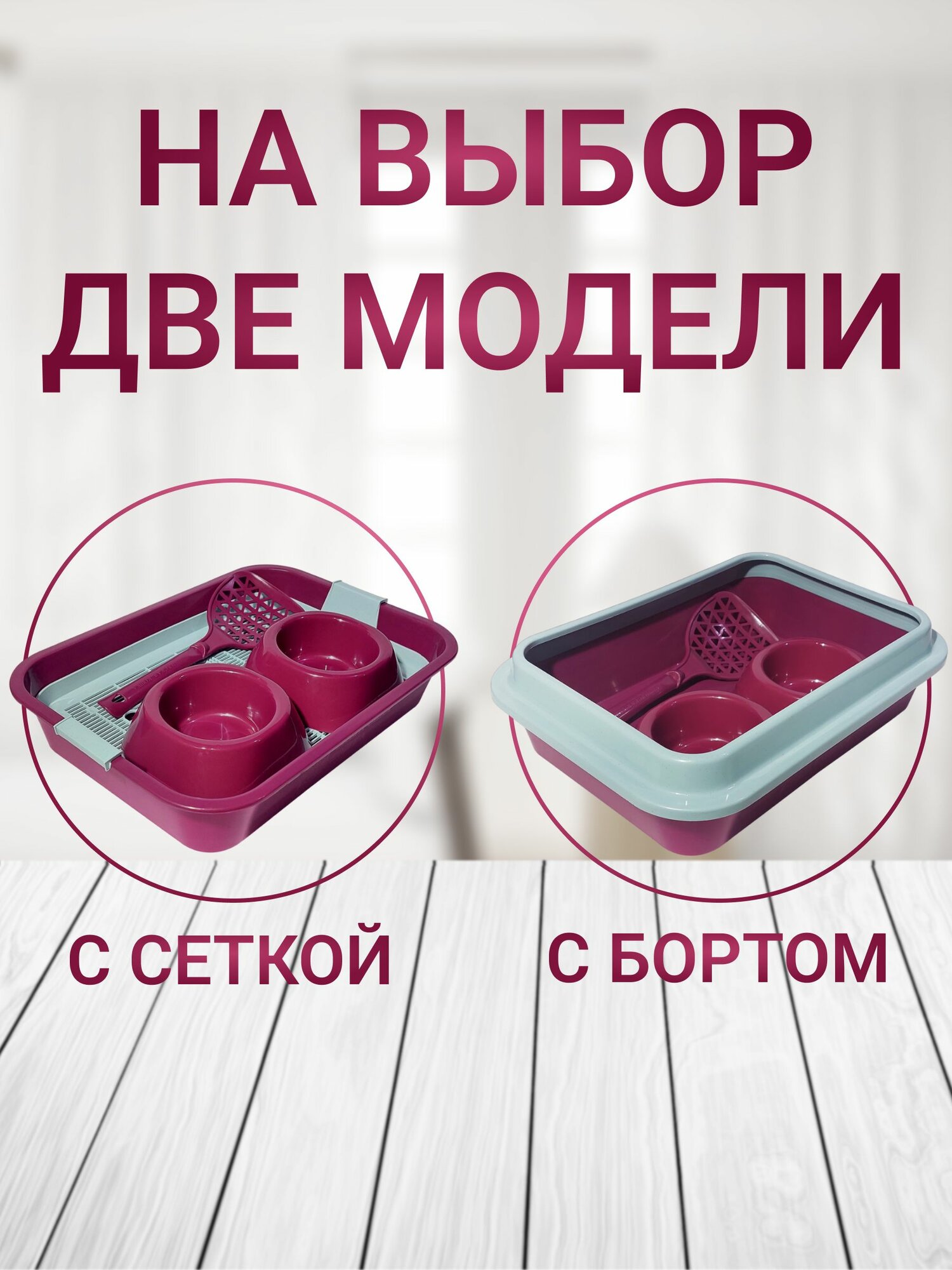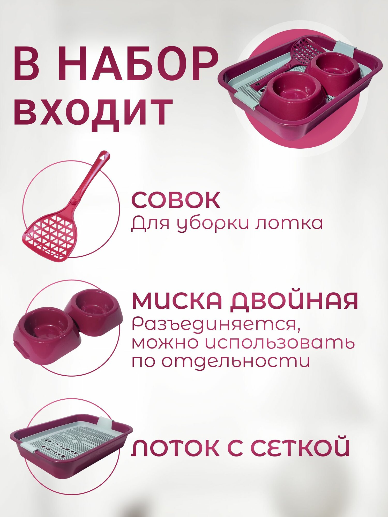 Набор для любимца (Туалет лоток с сеткой, миска двойная, совок) малиновый, 37,5*27*7,5 см интересное: