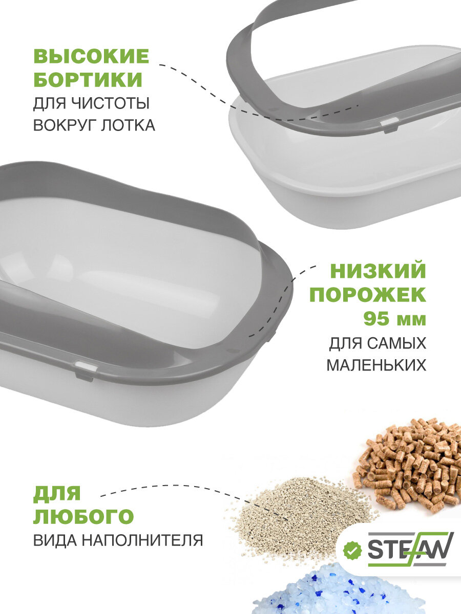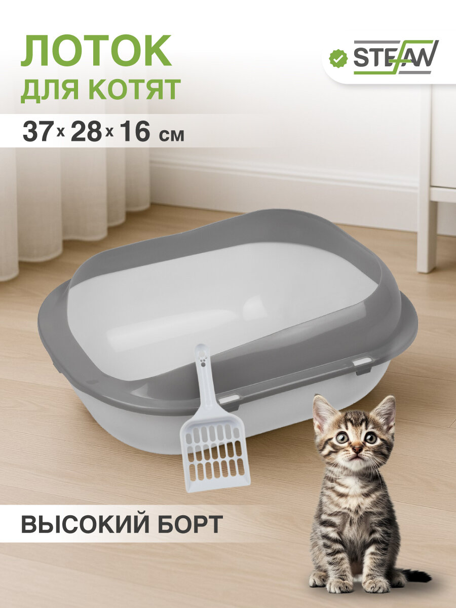 Туалет-лоток для котят и кошек с бортами и совком STEFAN, малый (S) 37х28х16, серый, BP2491