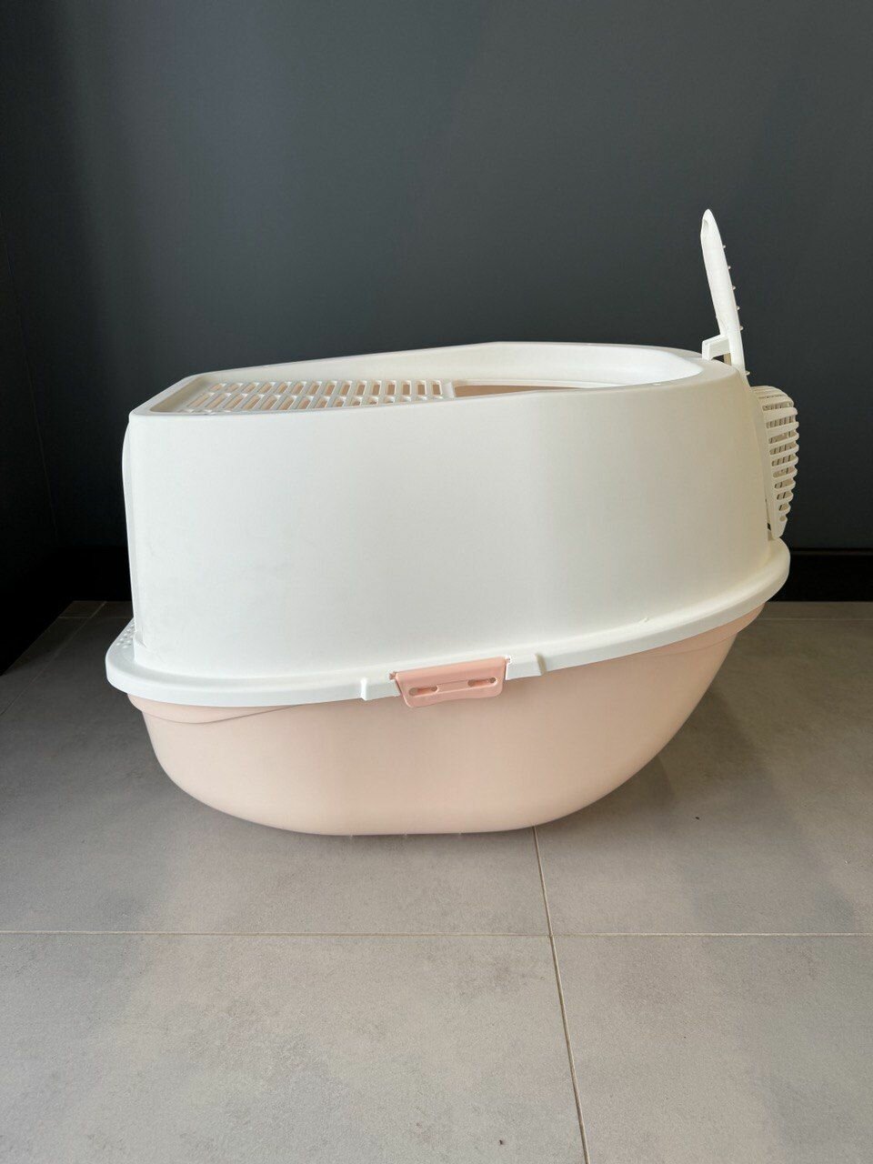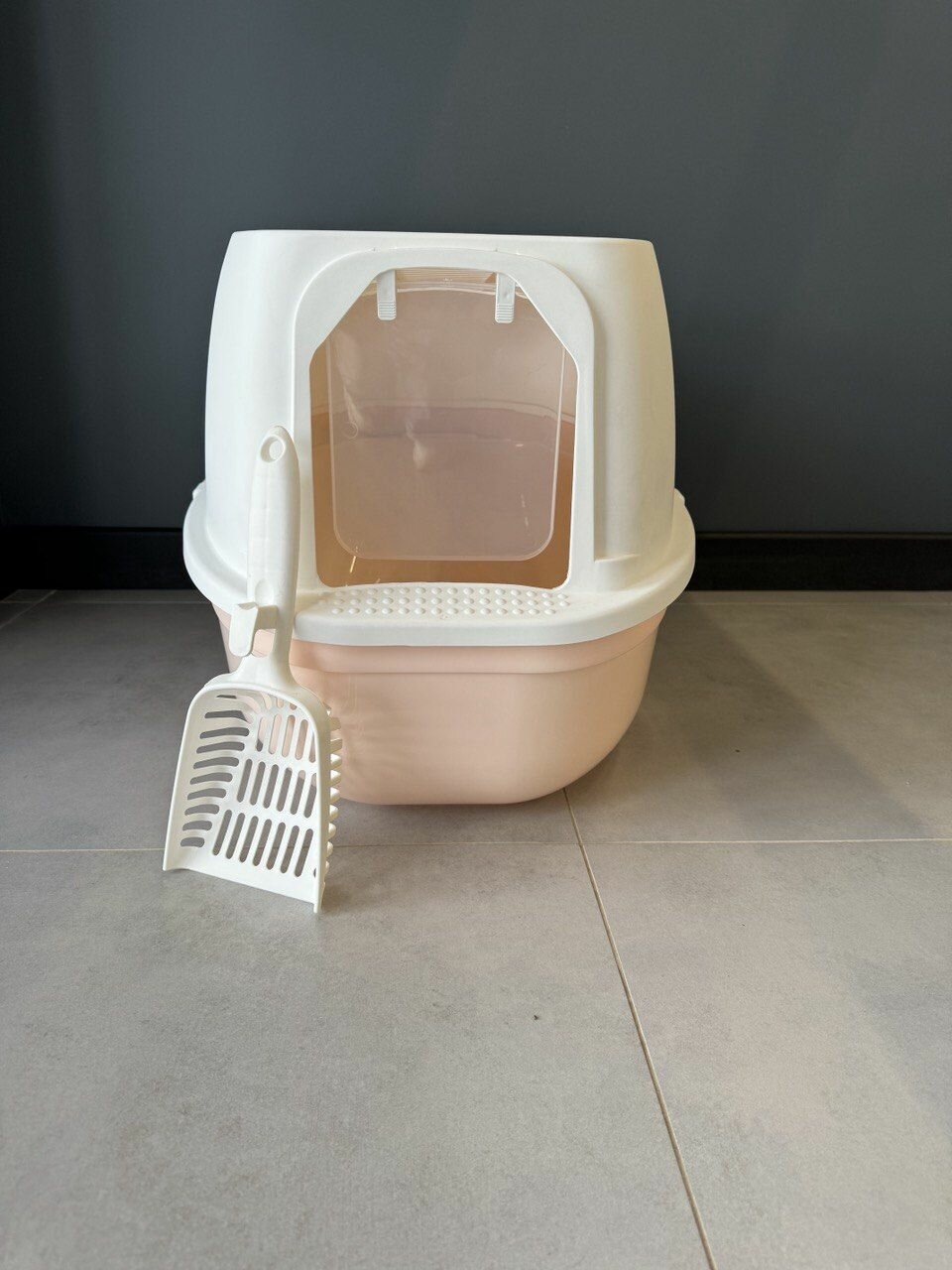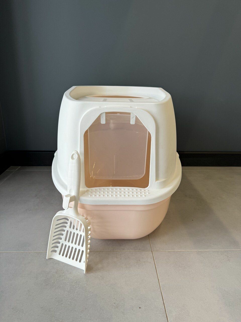 Купить Закрытый лоток (туалет) для кошек "Чистый котик", 40,7x61x41,5 см, дверь вовнутрь, люк, совок, розовый