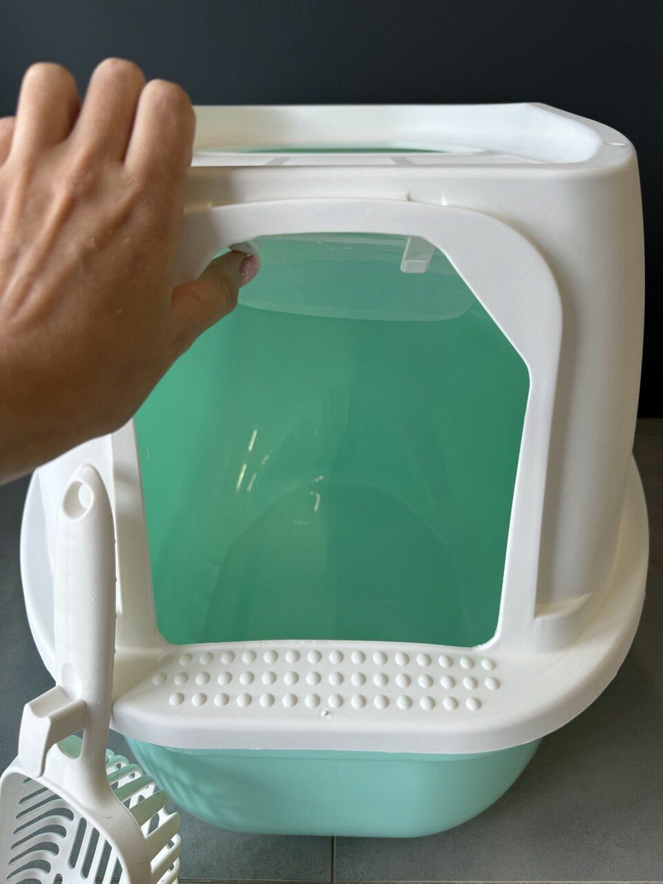 Закрытый лоток (туалет) для кошек "Чистый котик", 40,7x61x41,5 см, дверь вовнутрь, люк, совок, серый