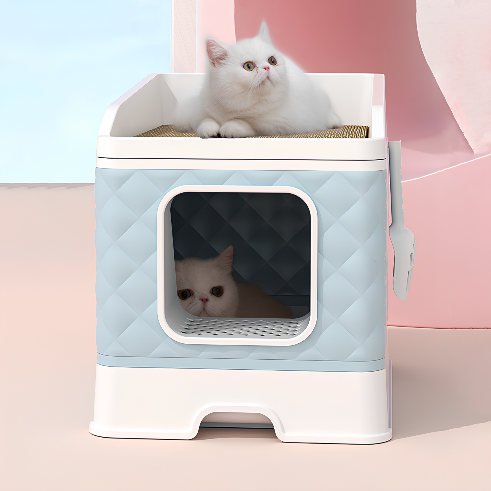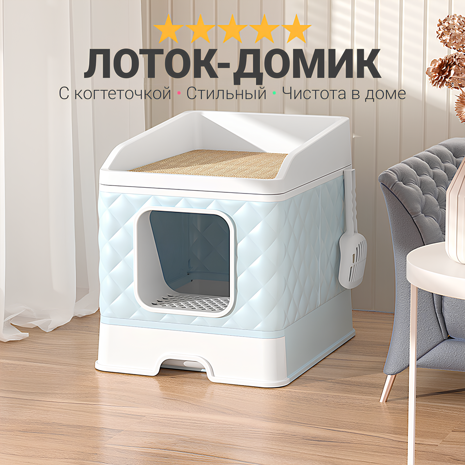 Купить Лоток для кошек закрытый с когтеточкой "Кошкин Дом", домик с стильным дизайном, без запаха, лопатка в комплекте, голубой