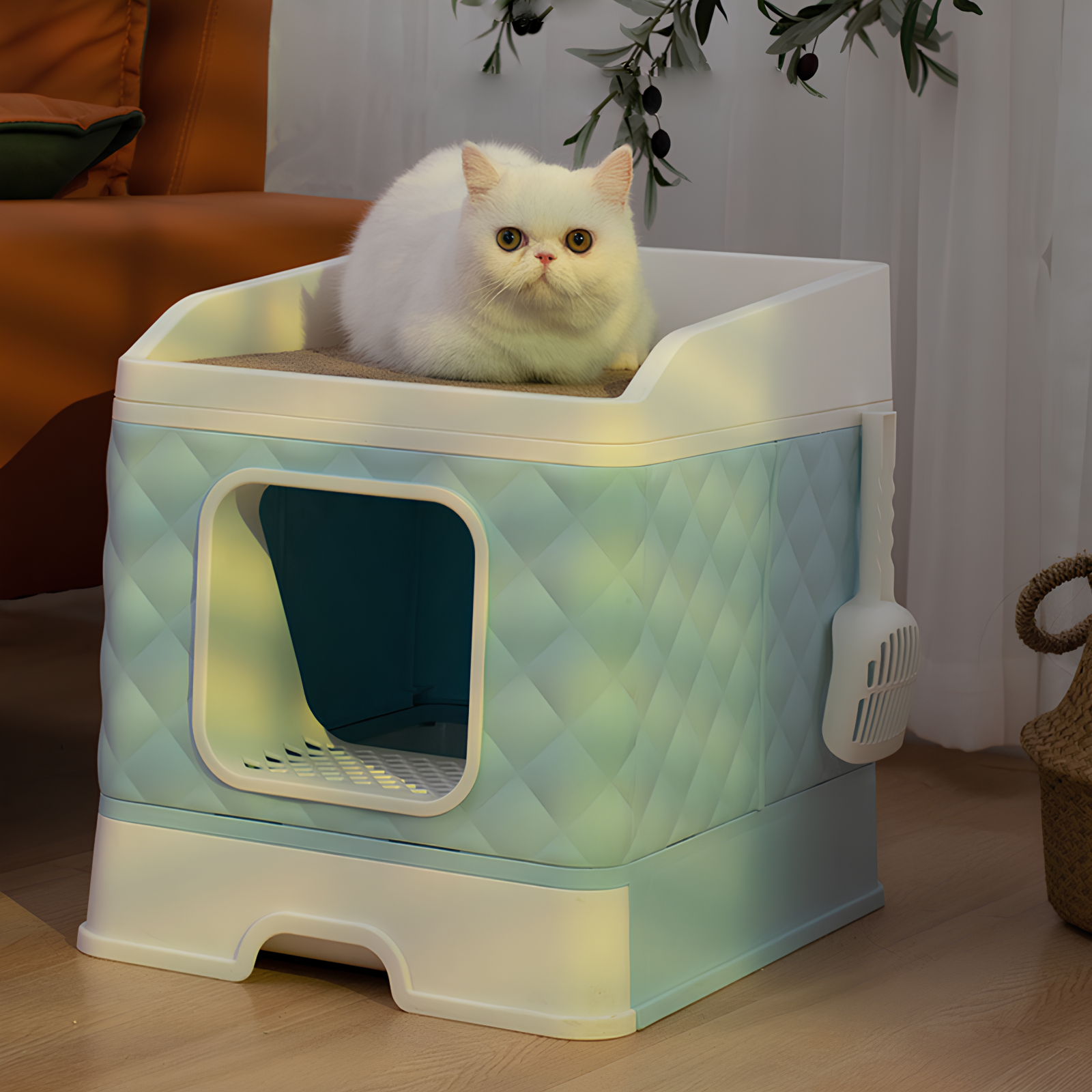 Лоток для кошек закрытый с когтеточкой "Кошкин Дом", домик с стильным дизайном, без запаха, лопатка в комплекте, зеленый