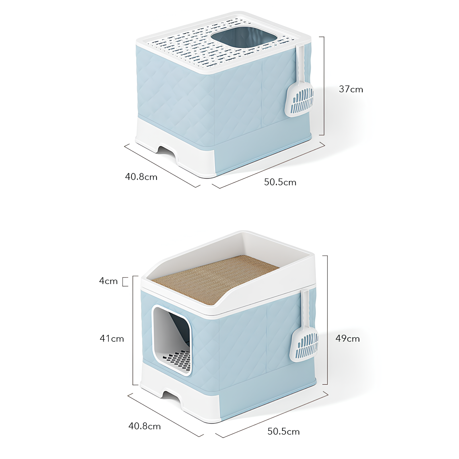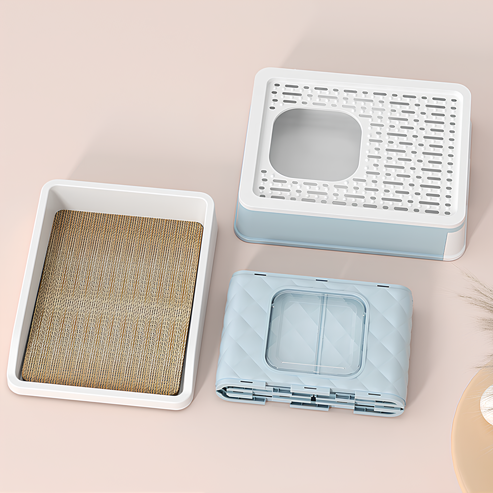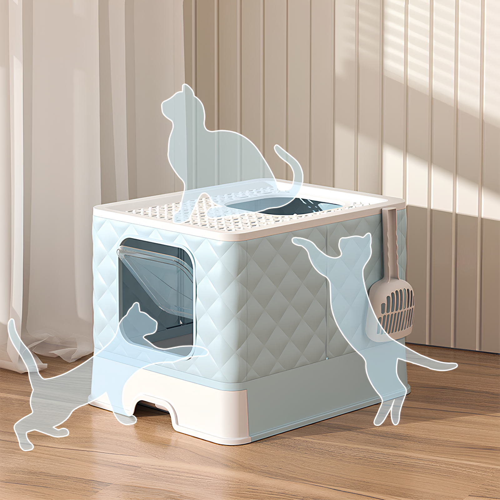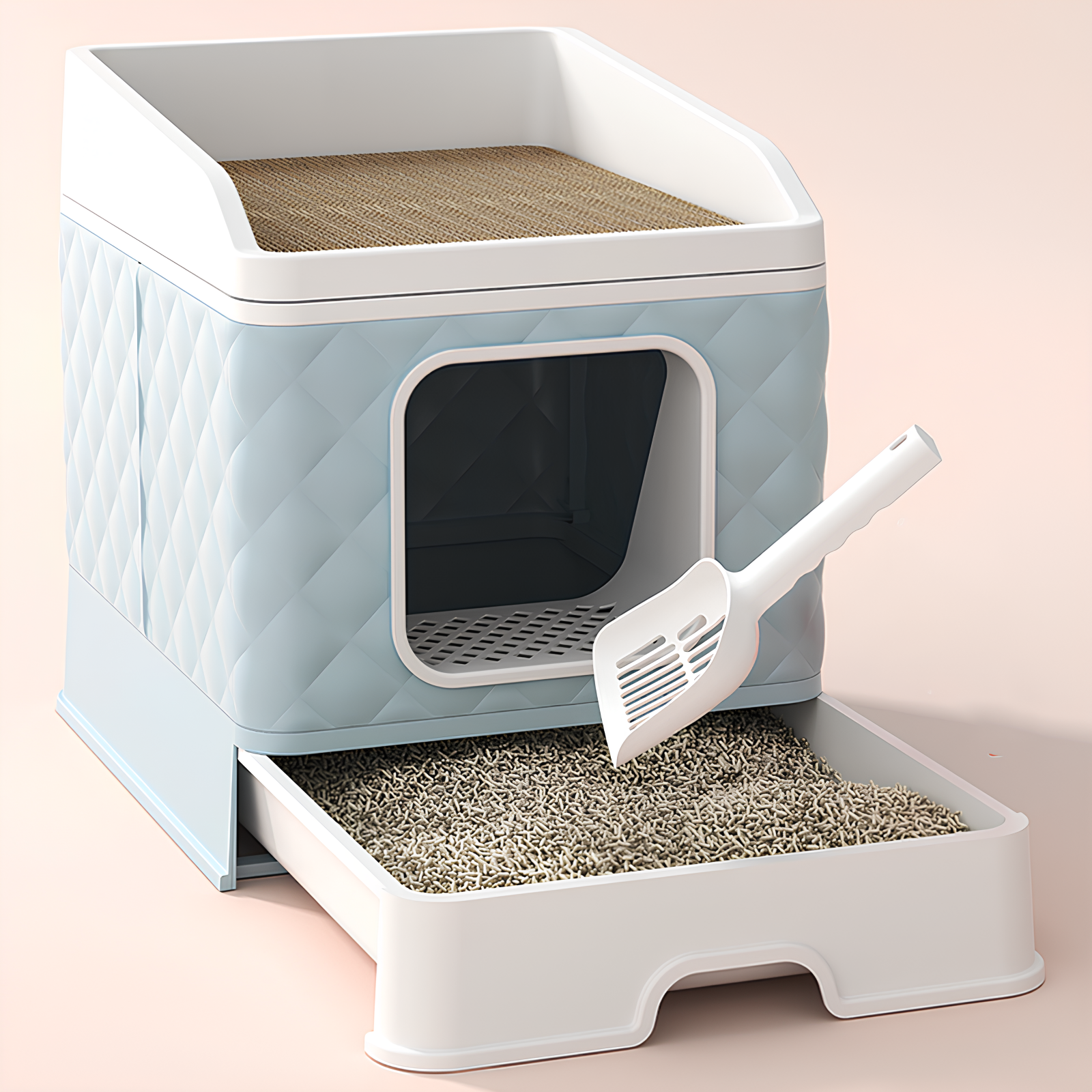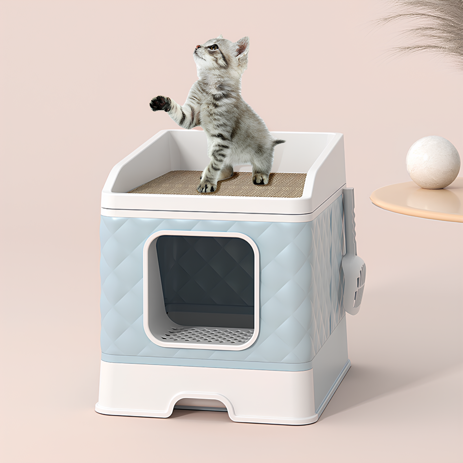 Лоток для кошек закрытый с когтеточкой "Кошкин Дом", домик с стильным дизайном, без запаха, лопатка в комплекте, голубой