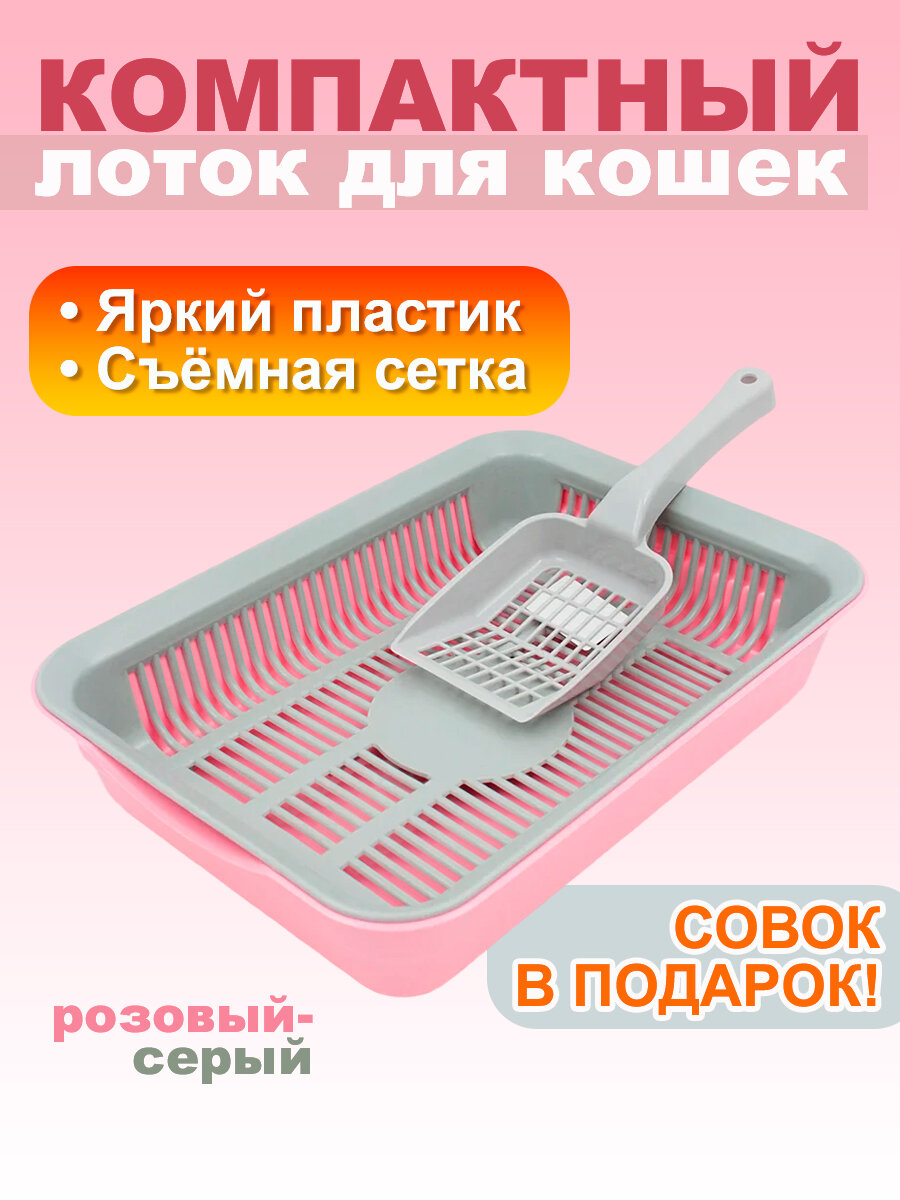 Купить Лоток для кошек с сеткой и лопаткой 34,5х25,5х7,5 см открытый №3, розовый-серый