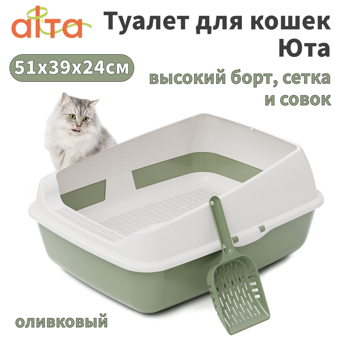 Альта М9061 туалет для кошек Юта с высокими бортами, сеткой и совком оливковый 51х39х24см интересное: