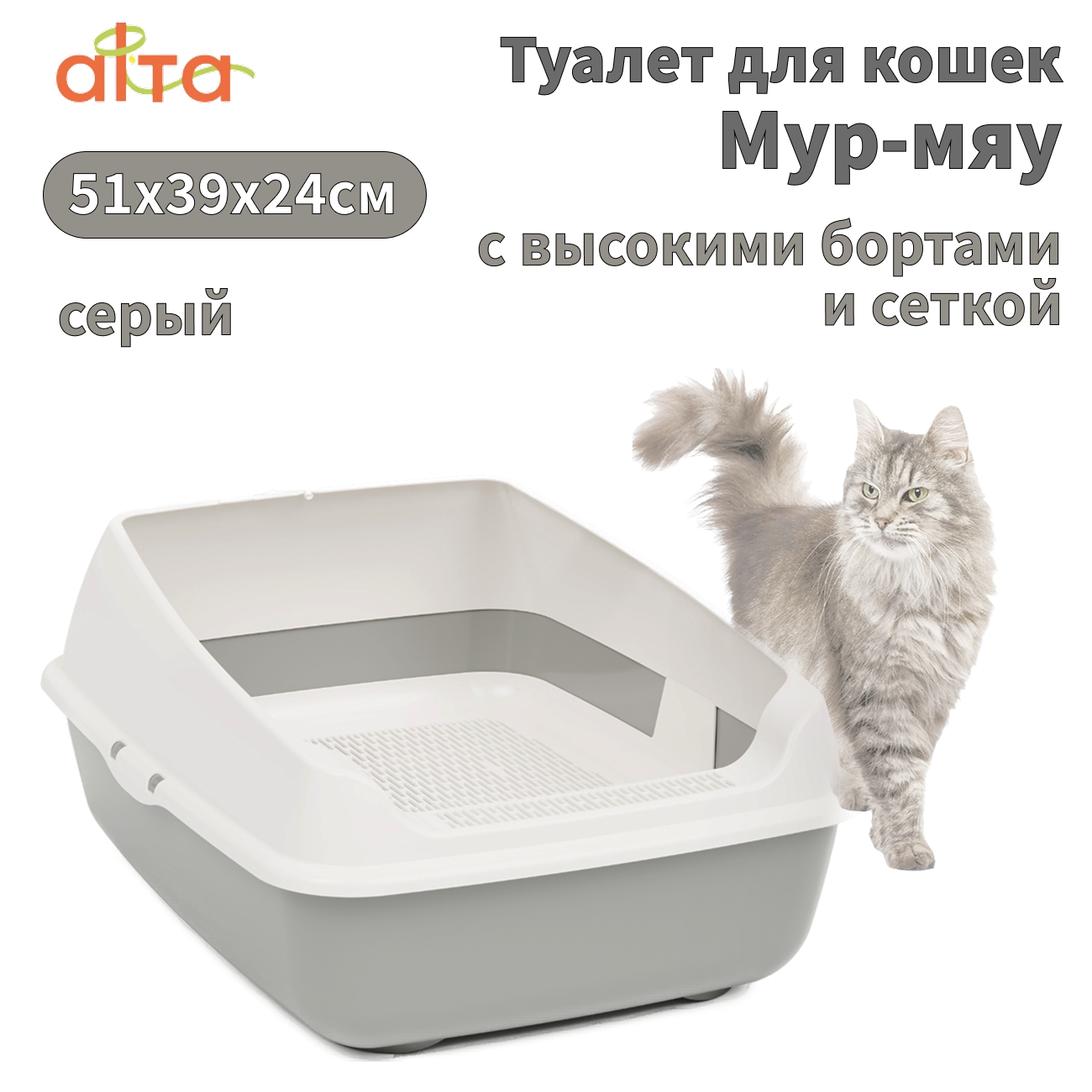 Альта М8577 туалет для кошек с высокими бортами и сеткой серый 51х39х24см интересное: