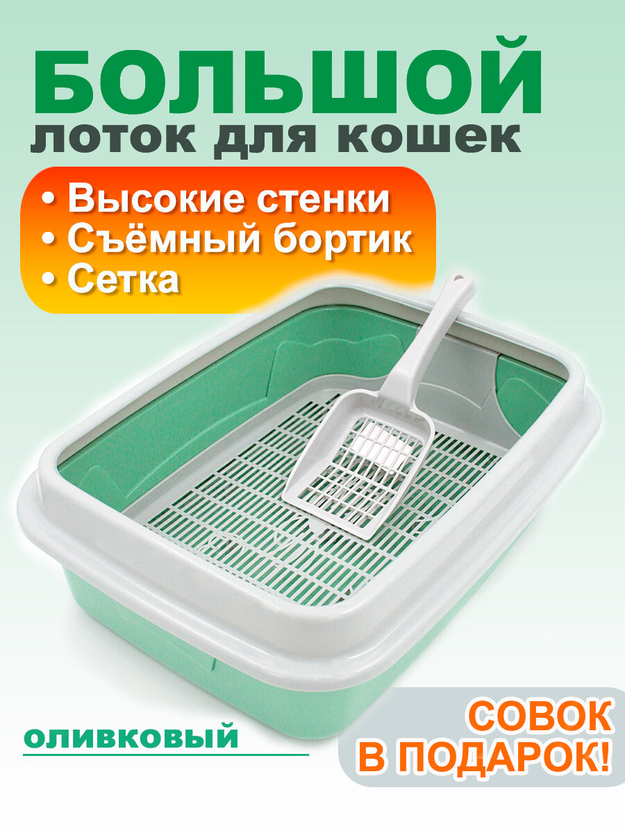 Кошачий туалет большой с сеткой, съемным бортиком и совком, оливковый интересное: