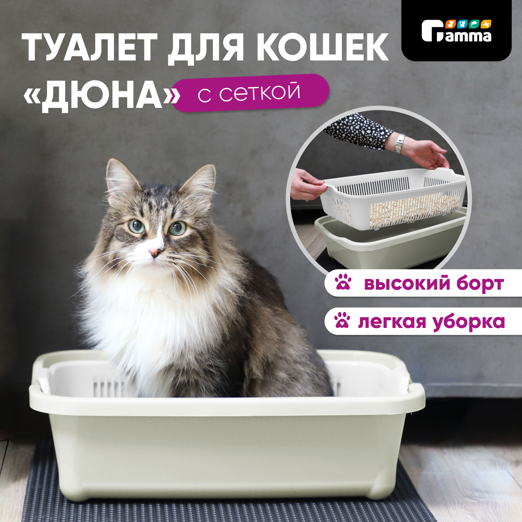Купить Лоток для кошек высокий с сеткой Gamma "Дюна", оливковый 42х32х12 см