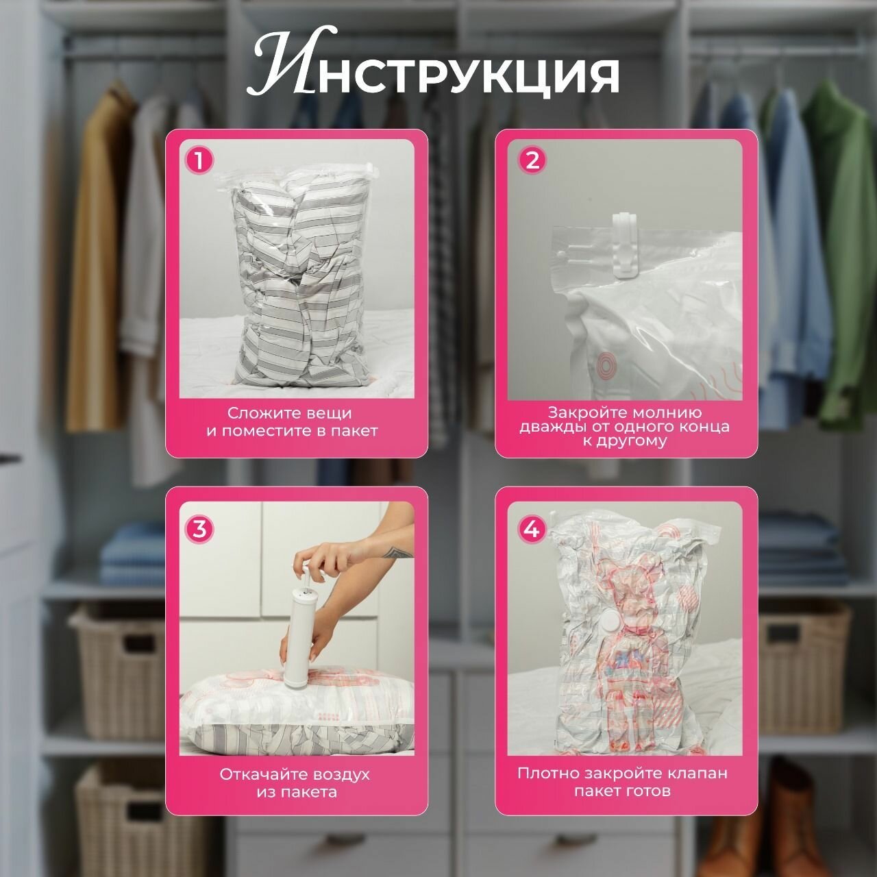 Вакуумные пакеты для хранения вещей 4 шт набор с насосои