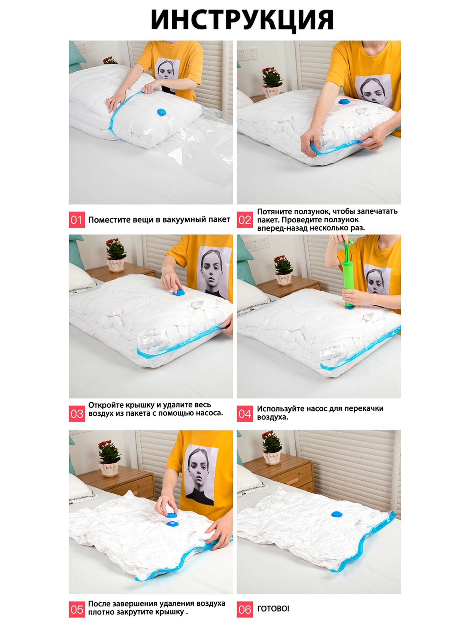 Вакуумный пакет для одежды 6 шт. 80х100 - 6шт. Насос - 1шт. Для дома с клапаном, для хранения вещей, мешки для игрушек, одеял, с двойным замком