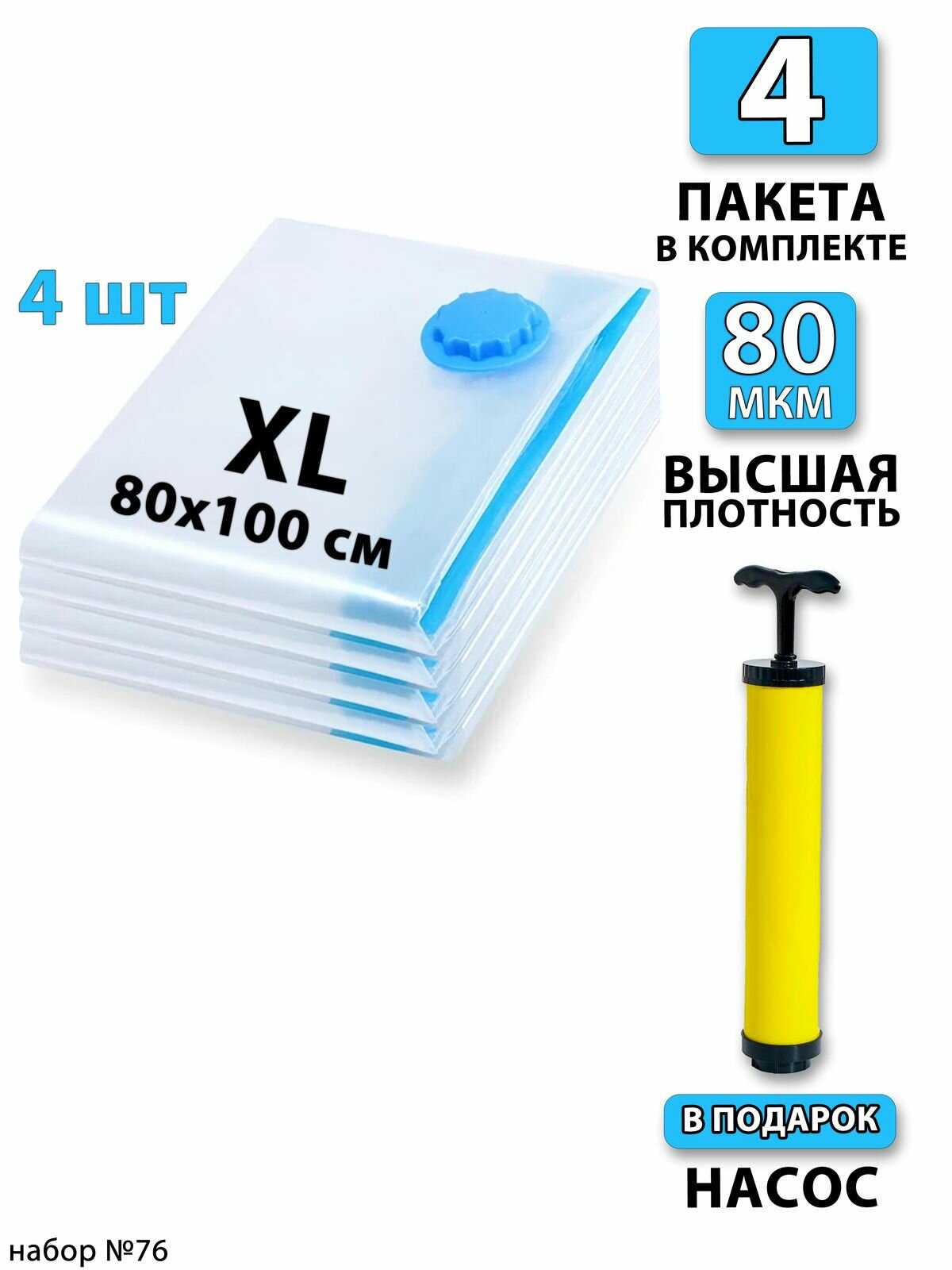 Купить Вакуумный пакет для одежды 4 шт. 80х100 - 4шт. Насос - 1шт. Для дома с клапаном, для хранения вещей, мешки для игрушек, одеял, с двойным замком