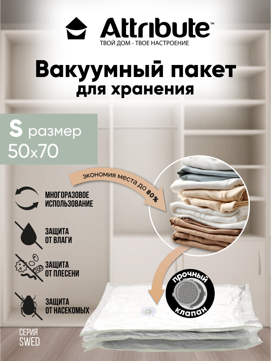 Вакуумный пакет ATTRIBUTE Home, для хранения одежды, 50х70х40см, объемный