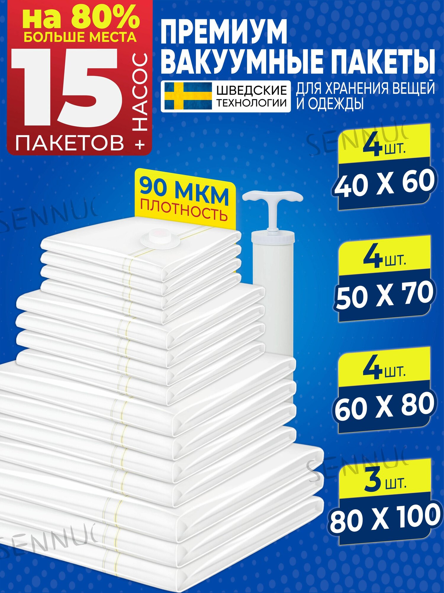 Купить Вакуумные пакеты для одежды 15 штук с насосом и клапаном многоразовые / Вакуумные мешки для хранения вещей, пуховиков
