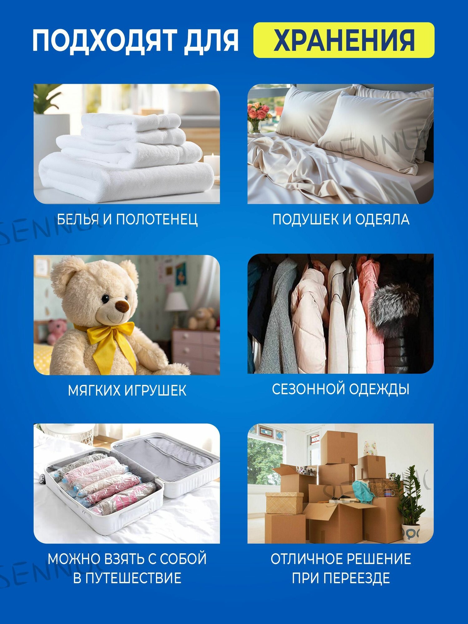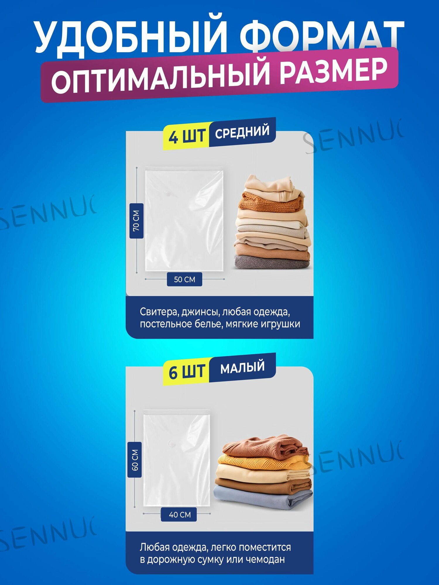 Вакуумные пакеты для одежды 10 штук с насосом и клапаном многоразовые / Вакуумные мешки для хранения вещей, одеял