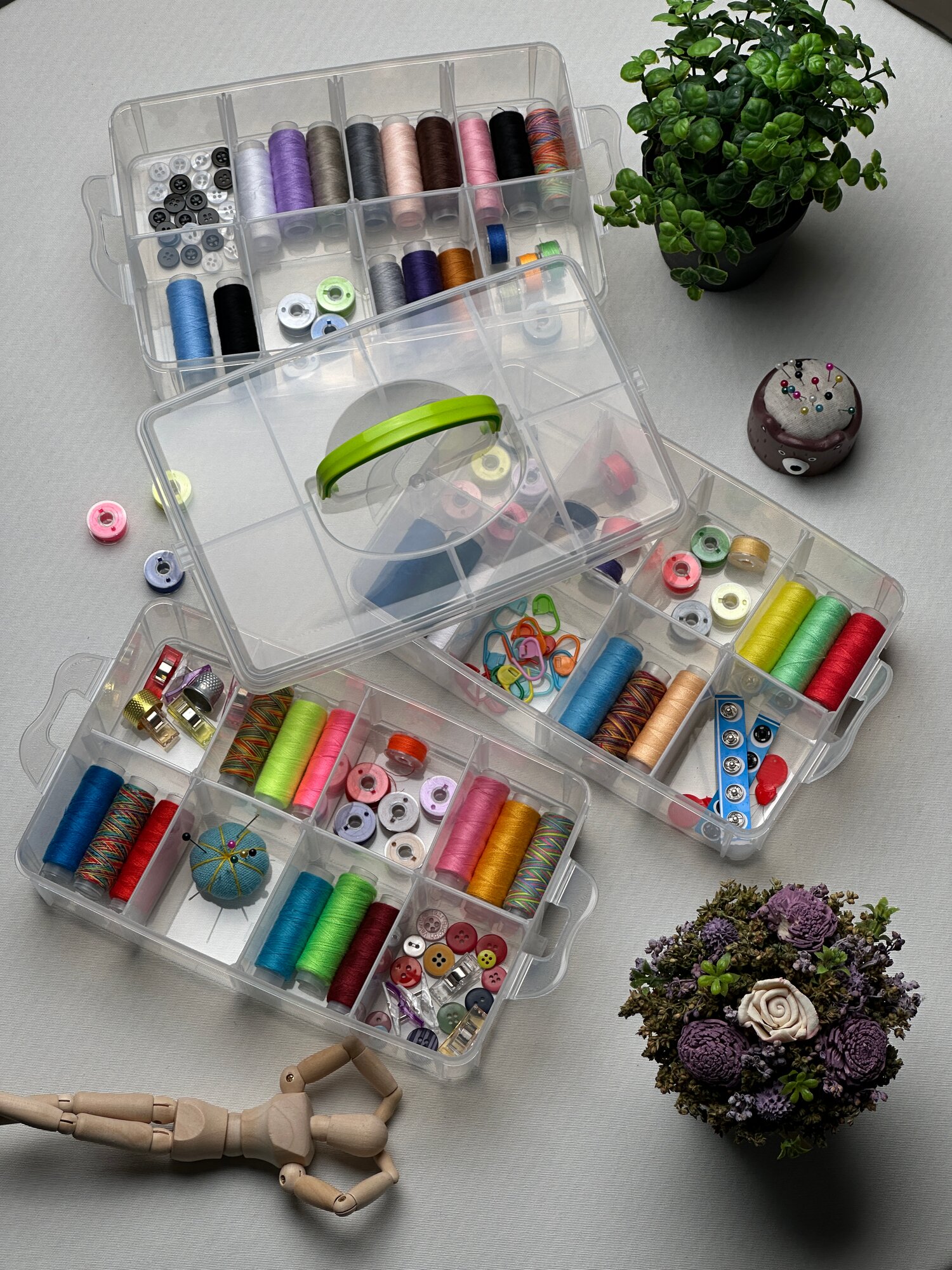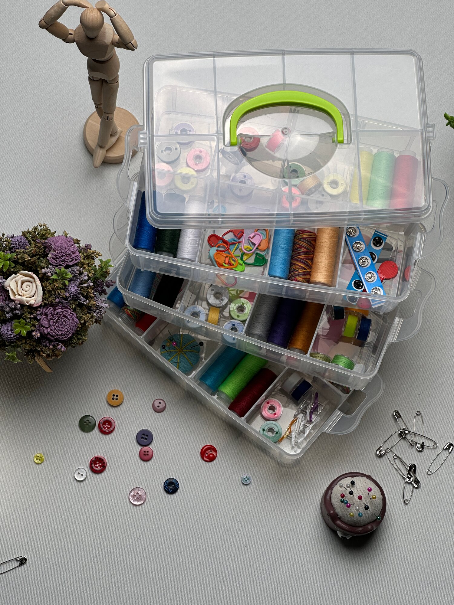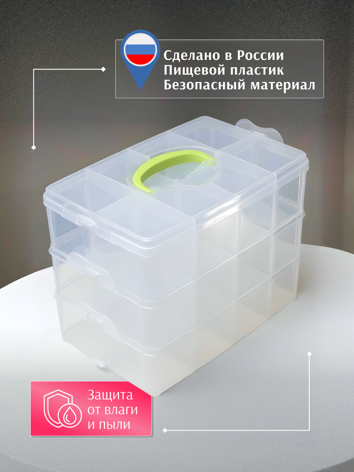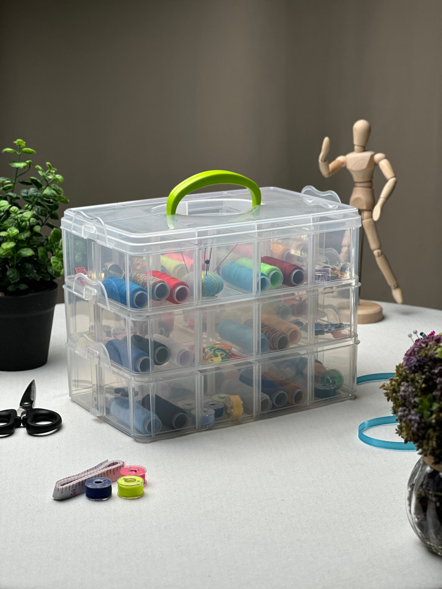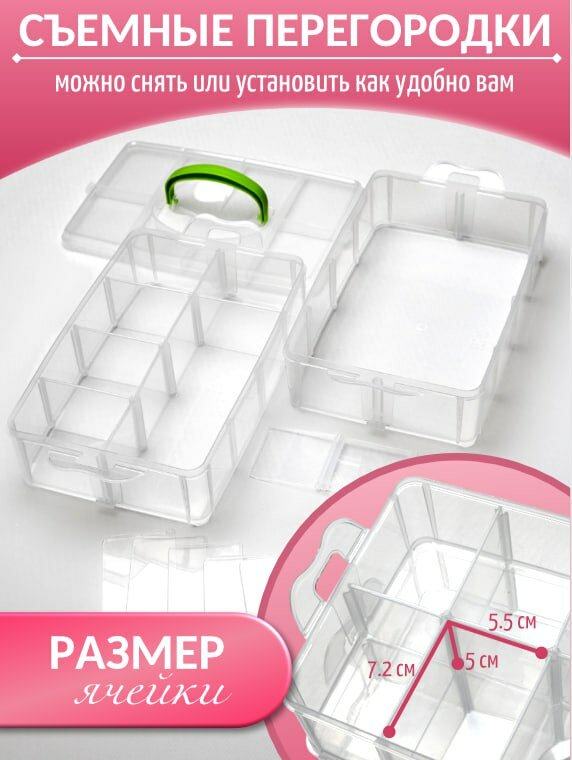 Органайзер для мелочи, канцелярии, шитья 3 съемные секции, ручка, 18 ячеек, 16,3x15,5x14 см, прозрачный