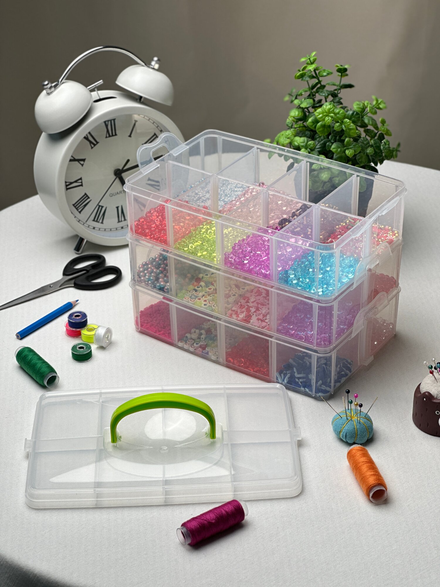 Купить Органайзер для рукоделия, контейнер для мелочи, канцелярии, пластик, 3 съемных отсека, ручка, 24,5x15,5x18,5 см