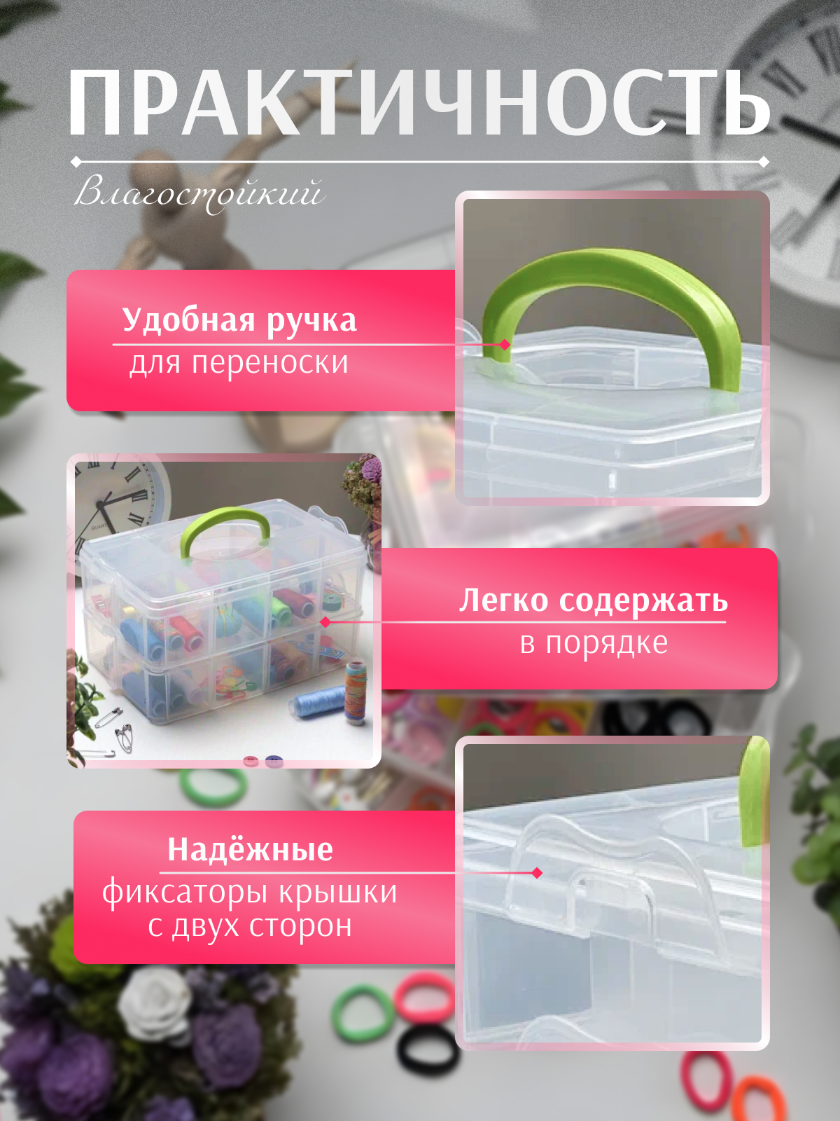 Органайзер для рукоделия, контейнер для мелочи, канцелярии, пластик, 3 съемных отсека, ручка, 24,5x15,5x18,5 см