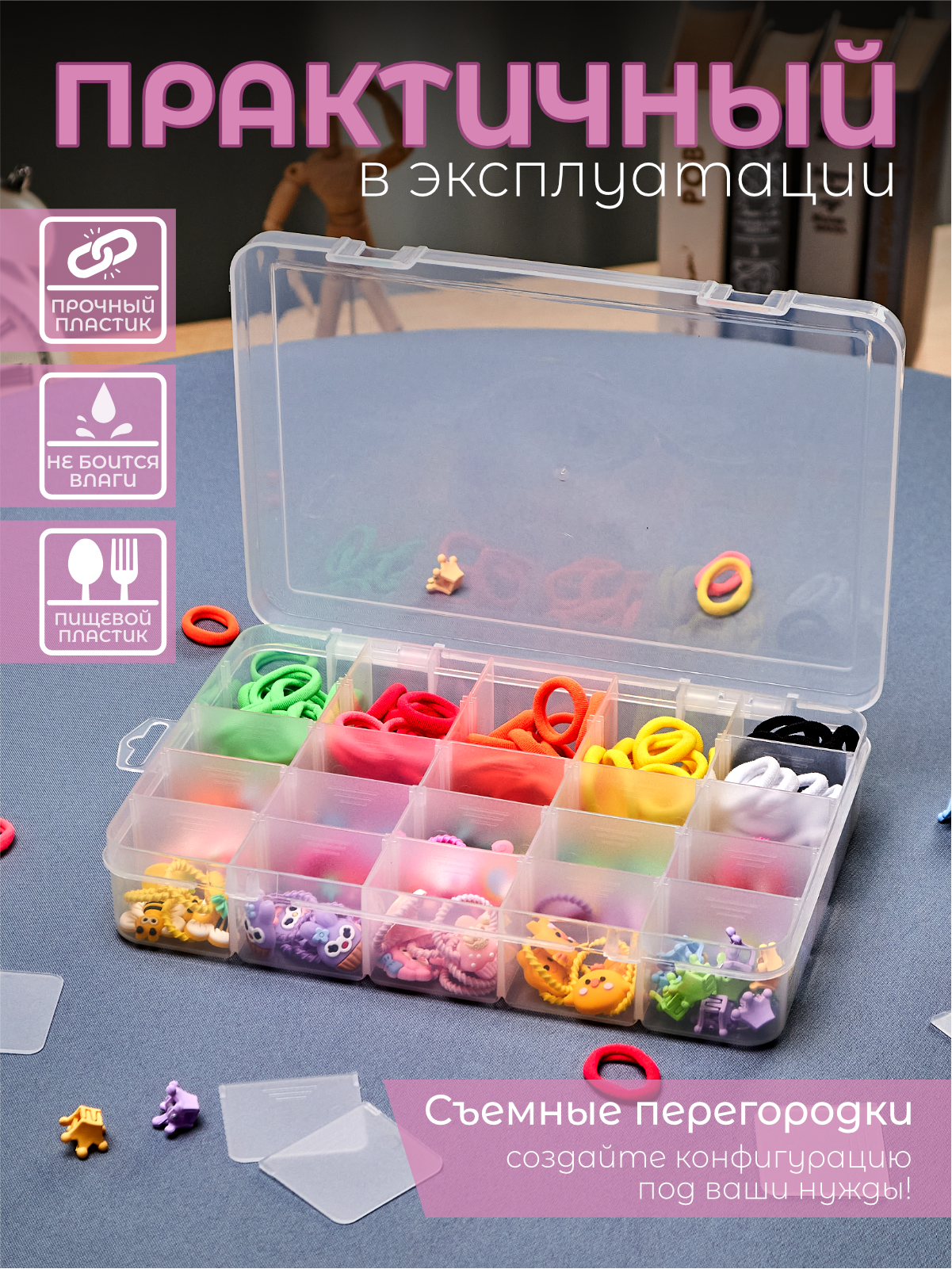 Органайзер для мелочи, канцелярии, шитья 3 съемные секции, ручка, 18 ячеек, 16,3x15,5x14 см, прозрачный
