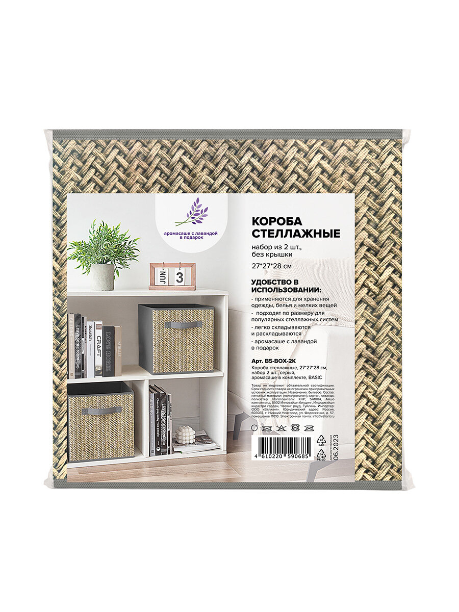 Купить Коробки для хранения вещей, короб для хранения стеллажный, корзина, ящик, набор 2 шт, 27*27*28 см, серый, BASIC