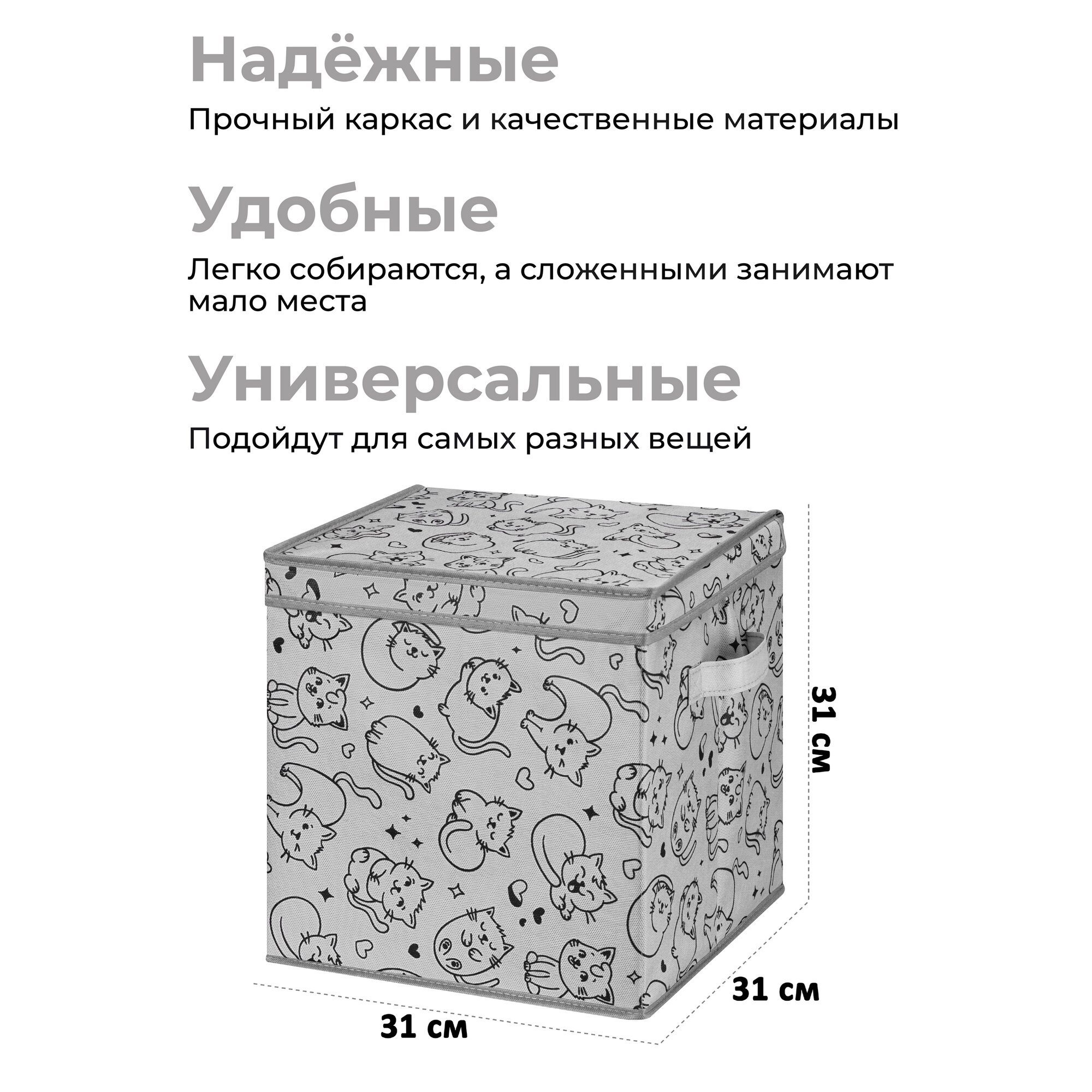 Ниже Вы можете прочитать отзывы на Короб, кофр, органайзер складной для хранения 31х31х31 см "Котик черный на сером"+ 2 ручки, с крышкой, квадрат, ознакомится с подробными характеристиками, посмотреть интересные обзоры и фотографии на Короб, кофр, органайзер складной для хранения 31х31х31 см "Котик черный на сером"+ 2 ручки, с крышкой, квадрат.