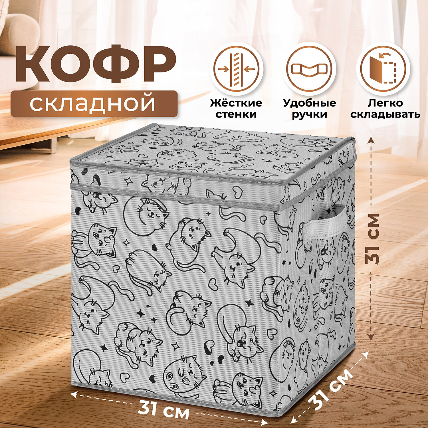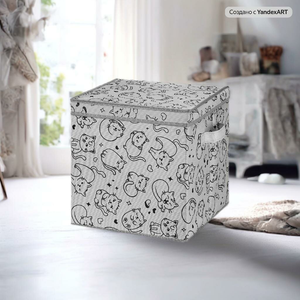 Короб, кофр, органайзер складной для хранения 31х31х31 см "Котик черный на сером"+ 2 ручки, с крышкой, квадрат интересное: