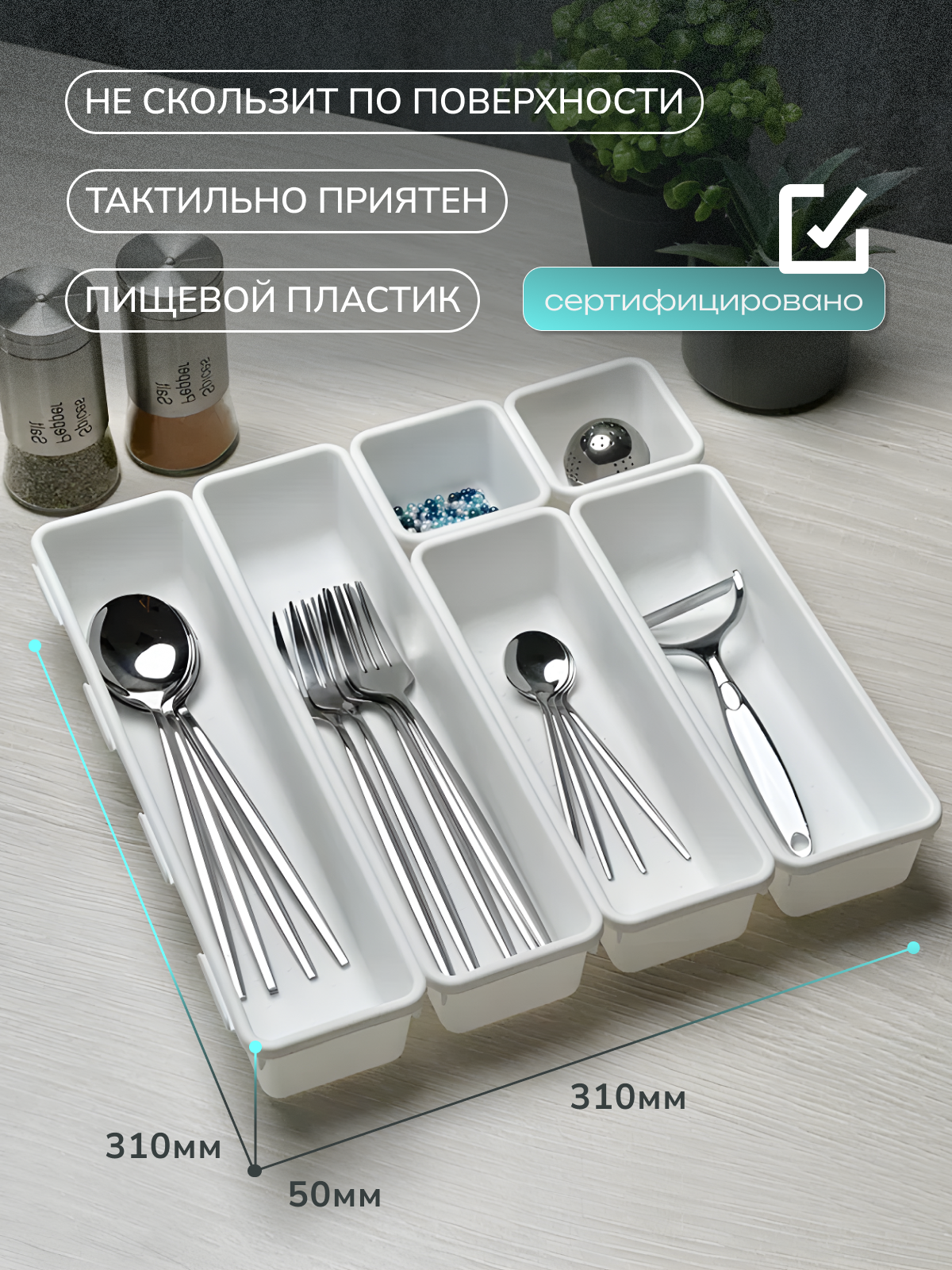 Купить Органайзер пластиковый для столовых приборов, канцелярии, косметики, мелочи, 31х31х5 см, 6 ячеек, белый