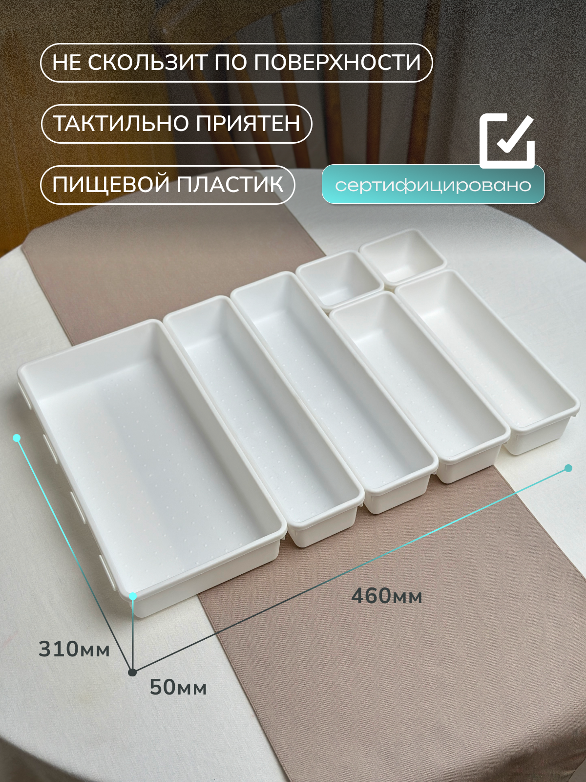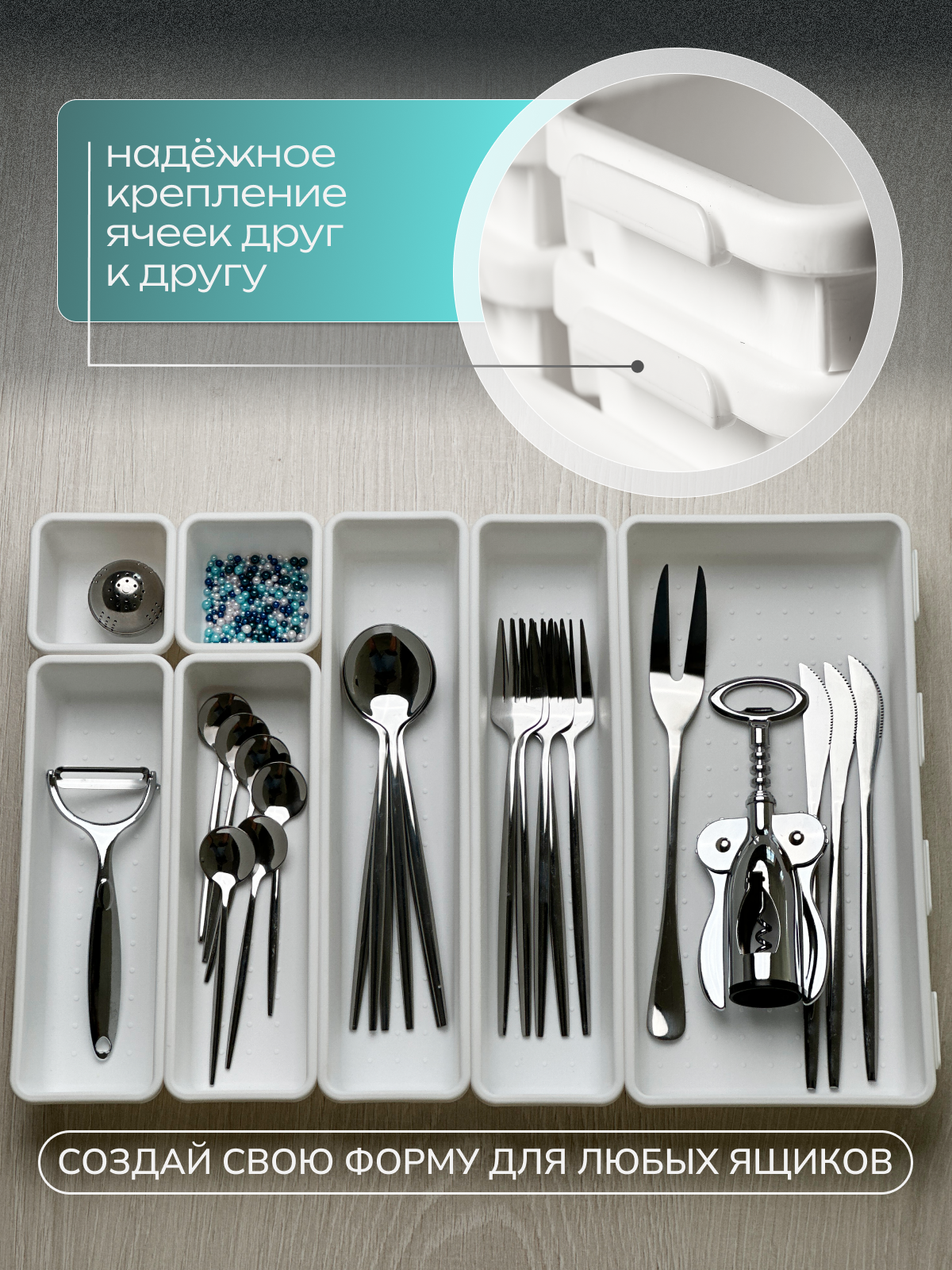 СохранитьОрганайзер для столовых приборов, канцелярии, косметики, мелочи, 46x31x5 см, 7 ячеек, белый интересное: