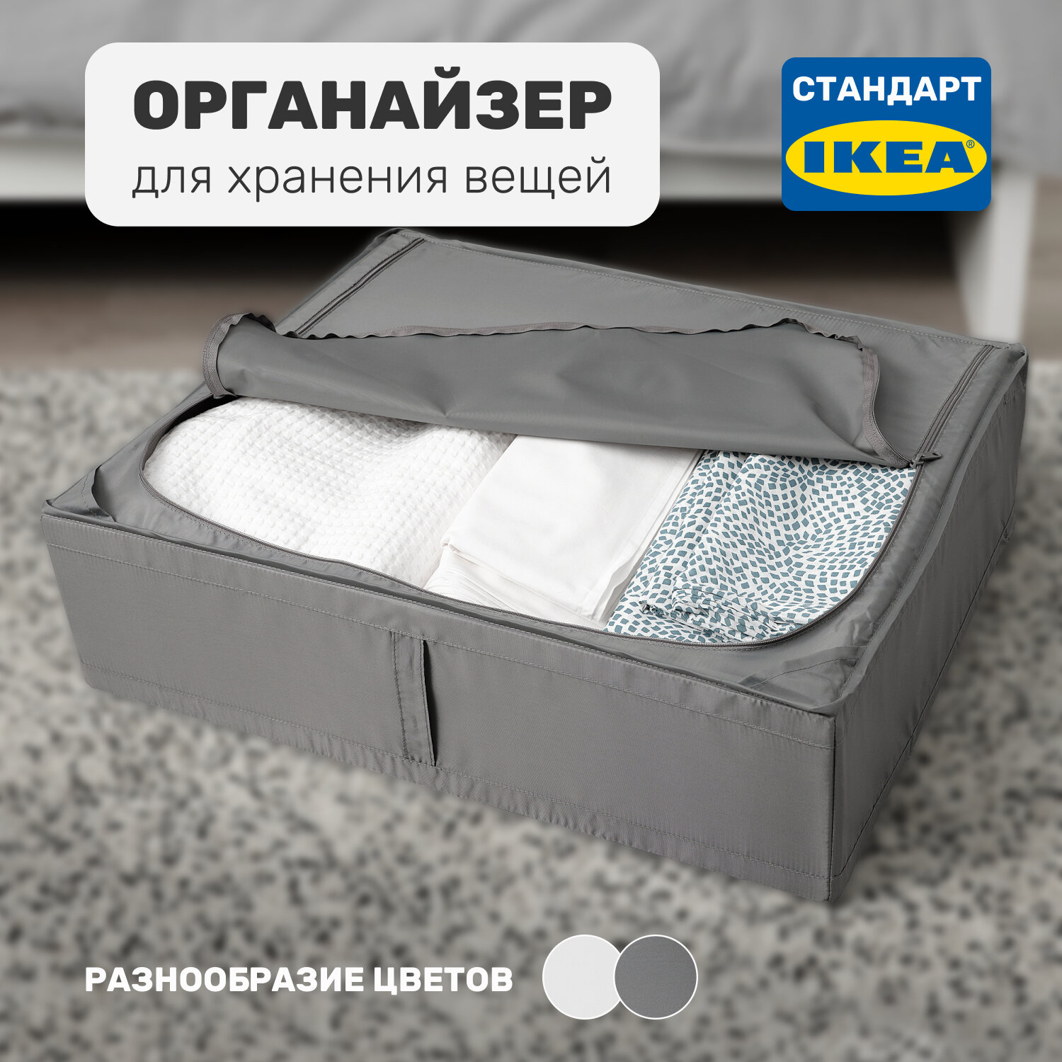 Органайзер/коробка/кофр для хранения вещей, одежды, белья, тканевый, складной, 71х51х18 см, белый/серый