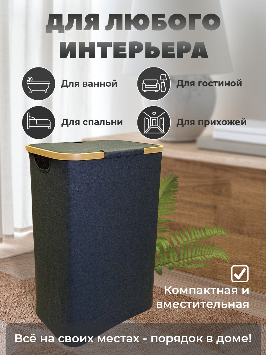 Корзина для белья ткань/ бамбук, бак для белья с крышкой, в ванную, в детскую 54л