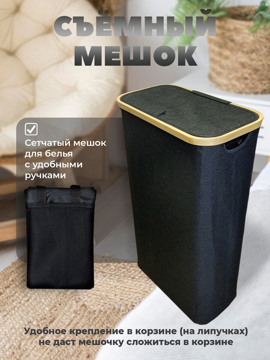 Корзина для белья ткань/ бамбук, бак для белья с крышкой, в ванную, в детскую 54л