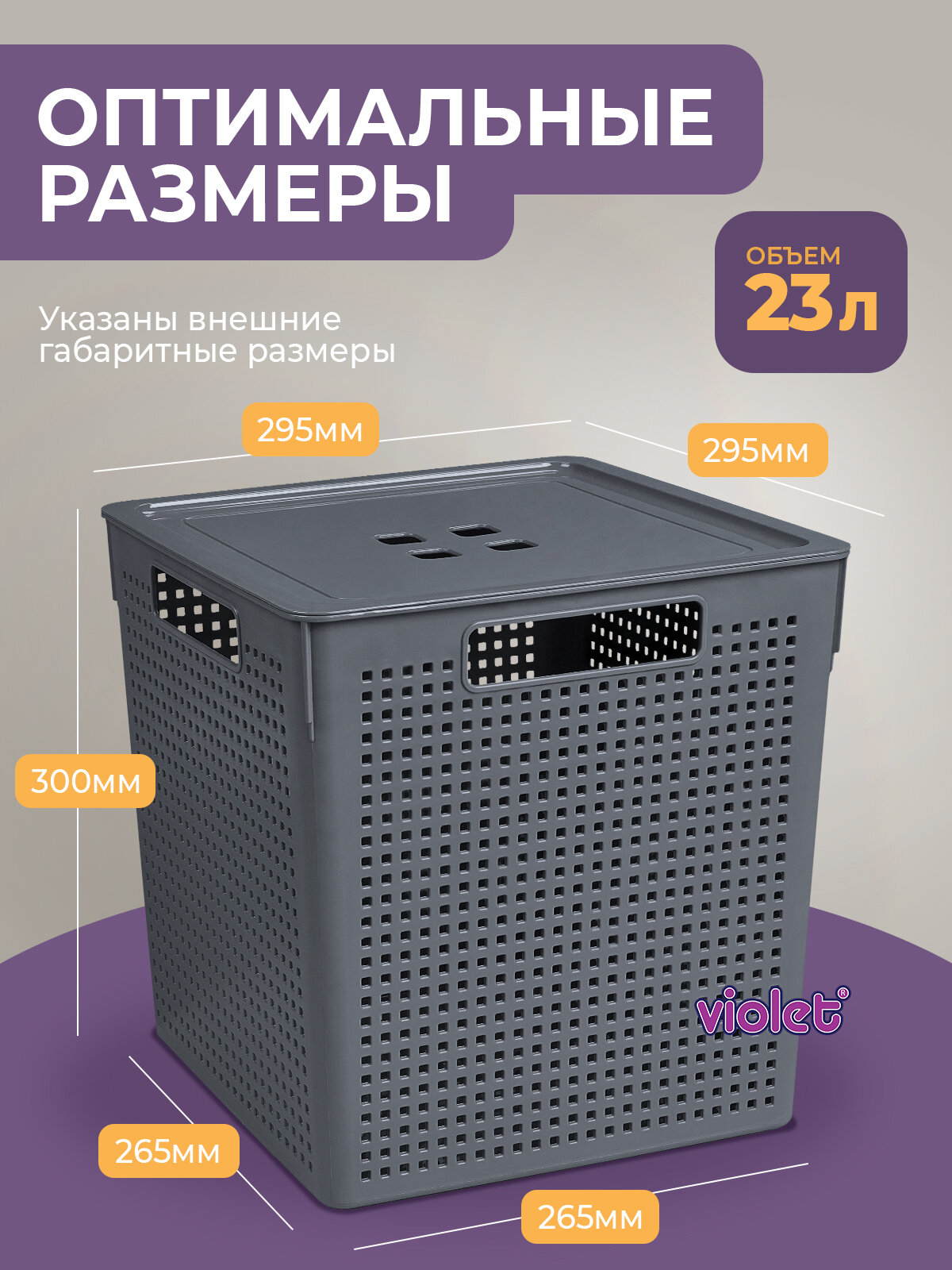 Купить Корзина с крышкой для хранения вещей Лофт 23л, цвет серый / ящик пластиковый, коробка, контейнер