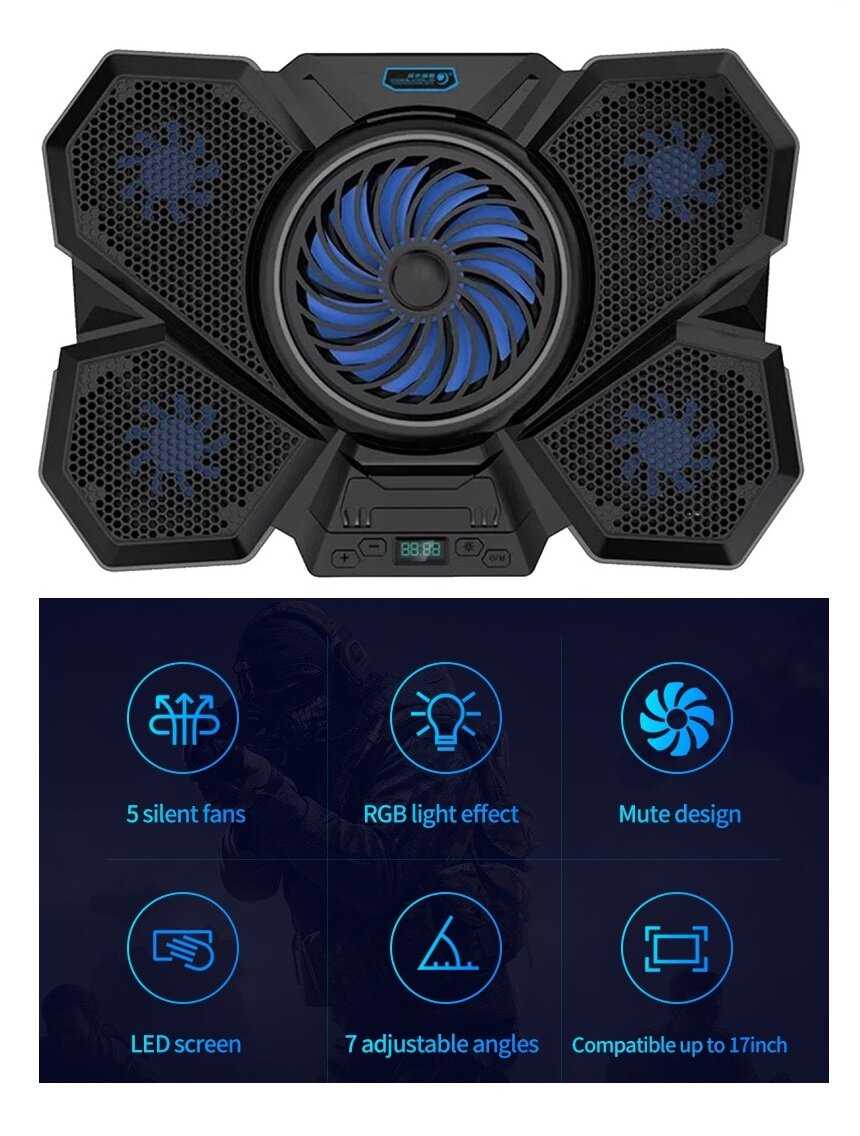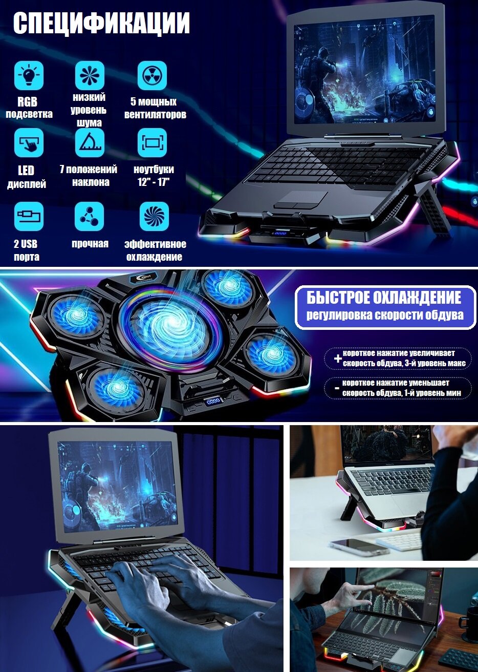 Ниже Вы можете прочитать отзывы на Подставка для ноутбука до 17" с охлаждением 5 вентиляторов RGB, ознакомится с подробными характеристиками, посмотреть интересные обзоры и фотографии на Подставка для ноутбука до 17" с охлаждением 5 вентиляторов RGB.