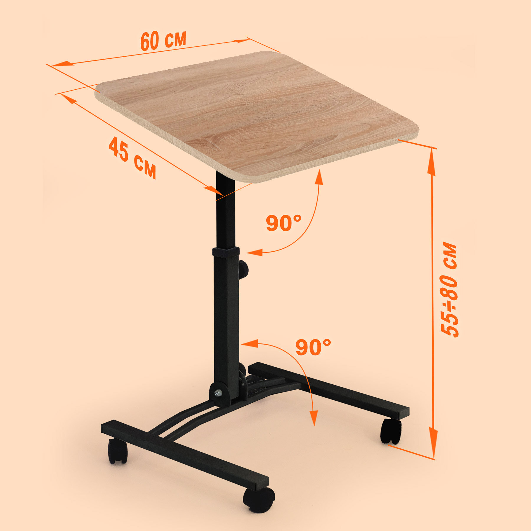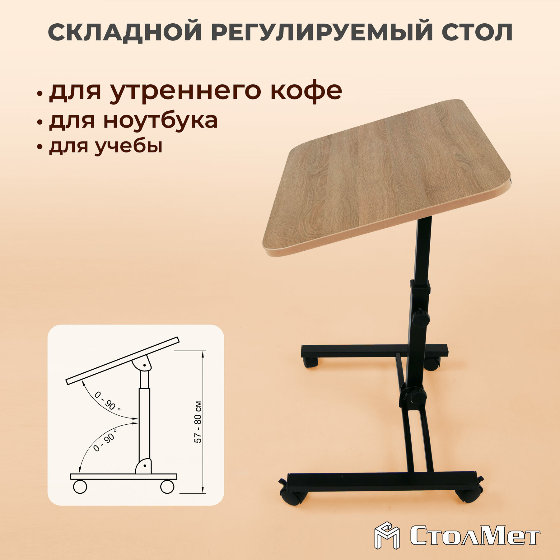 Складной стол для ноутбука на колесах «Твист-2» с регулировкой высоты и угла наклона, дуб делано, черный