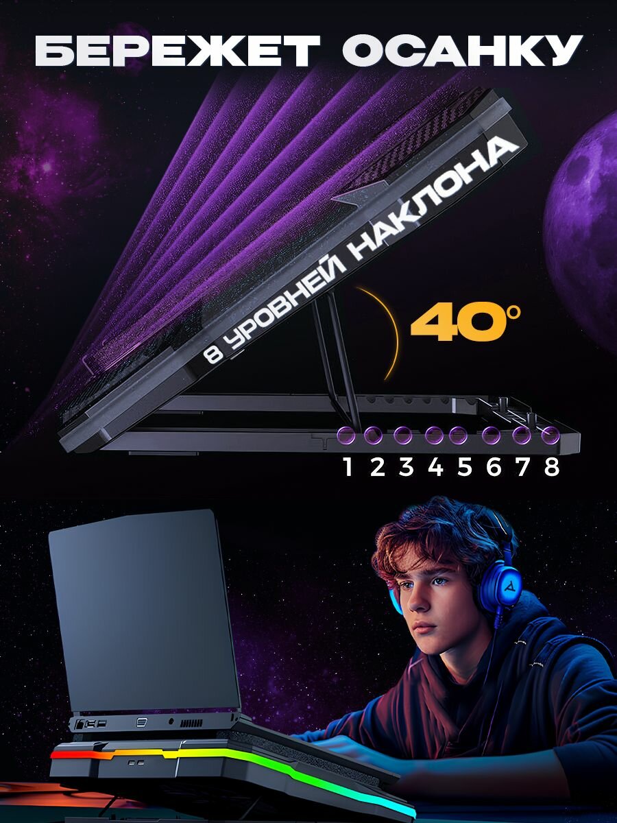 Регулируемая охлаждающая подставка для ноутбуков, 2 вентилятора, подсветка, 5 углов наклона, держатель для смартфона, 2 USB , для экрана 13"-19"