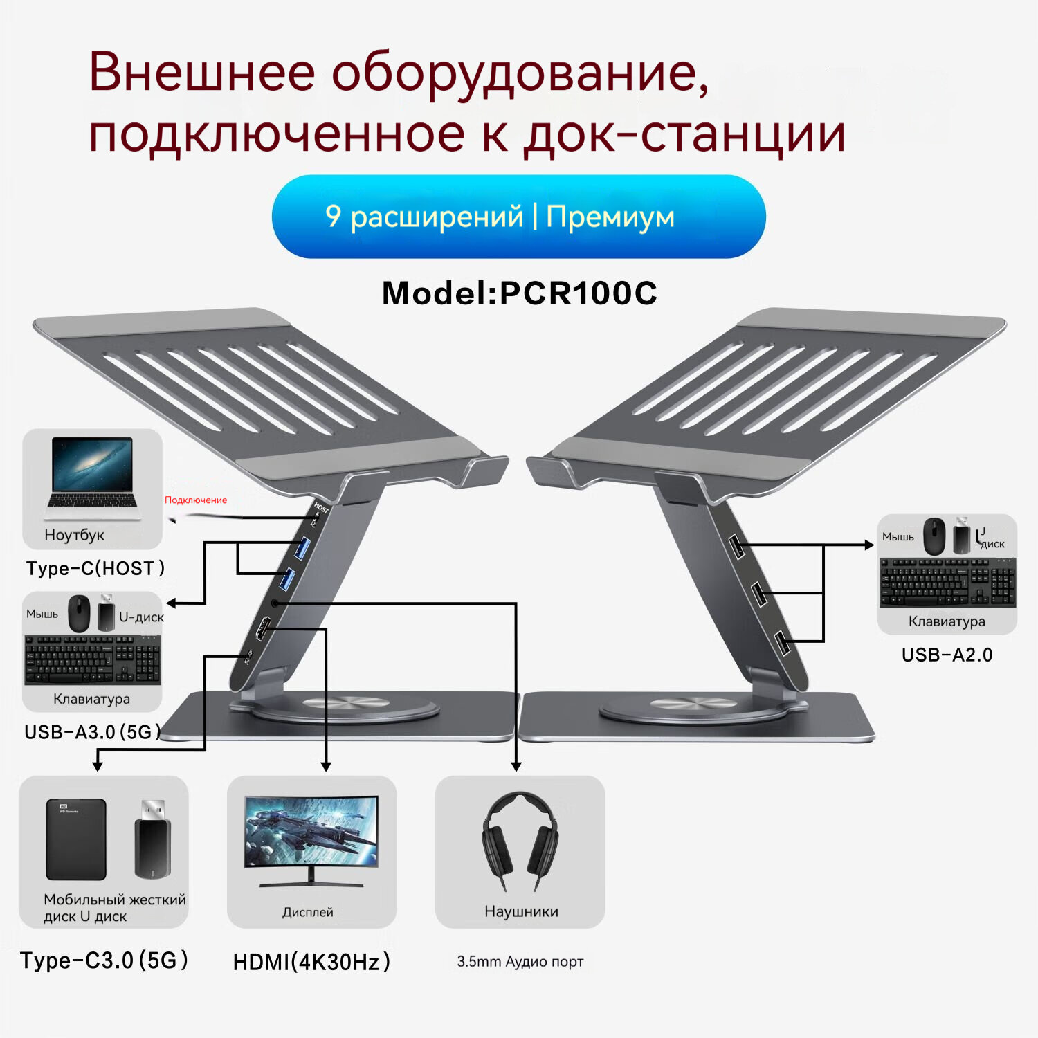Подставка для ноутбука Han Zichen PCR100D, поворотная и подъемная, [12-портовое расширение/ultimate edition] PCR100D