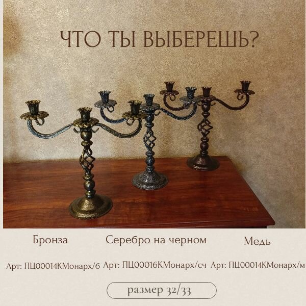 Подсвечник-канделябр Монарх, кованый, высокий на 3 свечи, серебро на черном, выс.32, шир.33, d. отв. под свечу до 2,2 см интересное: