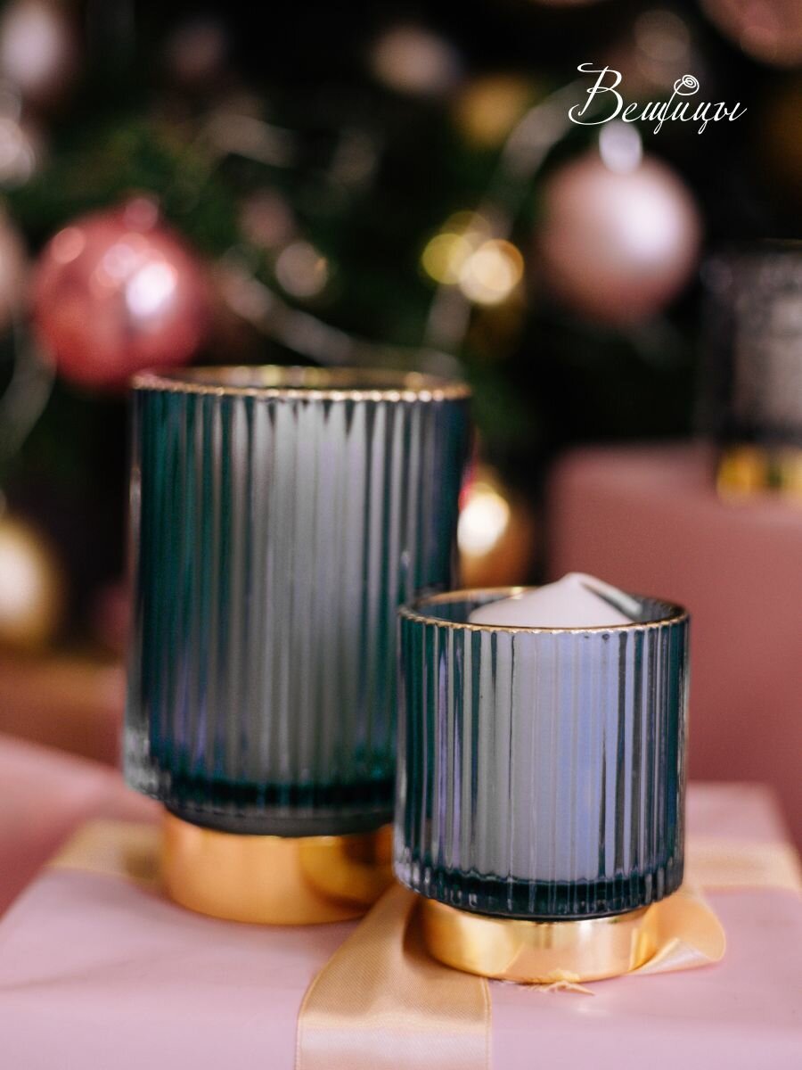 Подсвечник декоративный Вещицы из цветного стекла 13 см / Для декора свечей / Цвет зеленый, золотой