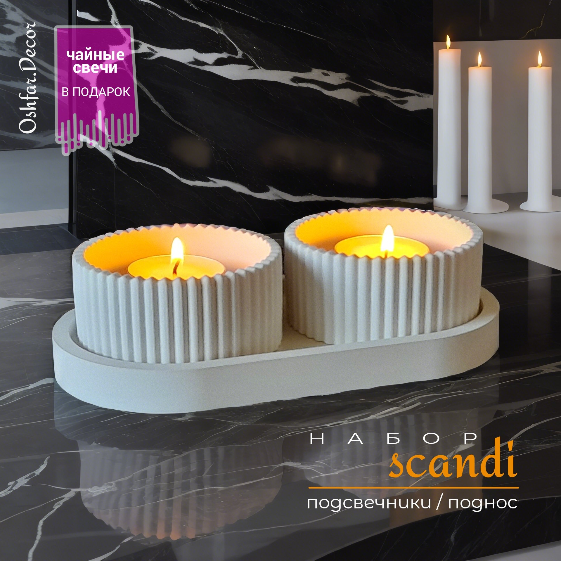 Купить Подсвечники "Scandi" из гипса на белом подносе, набор из 3 предметов. Подарок на новый год. Oshfar Decor