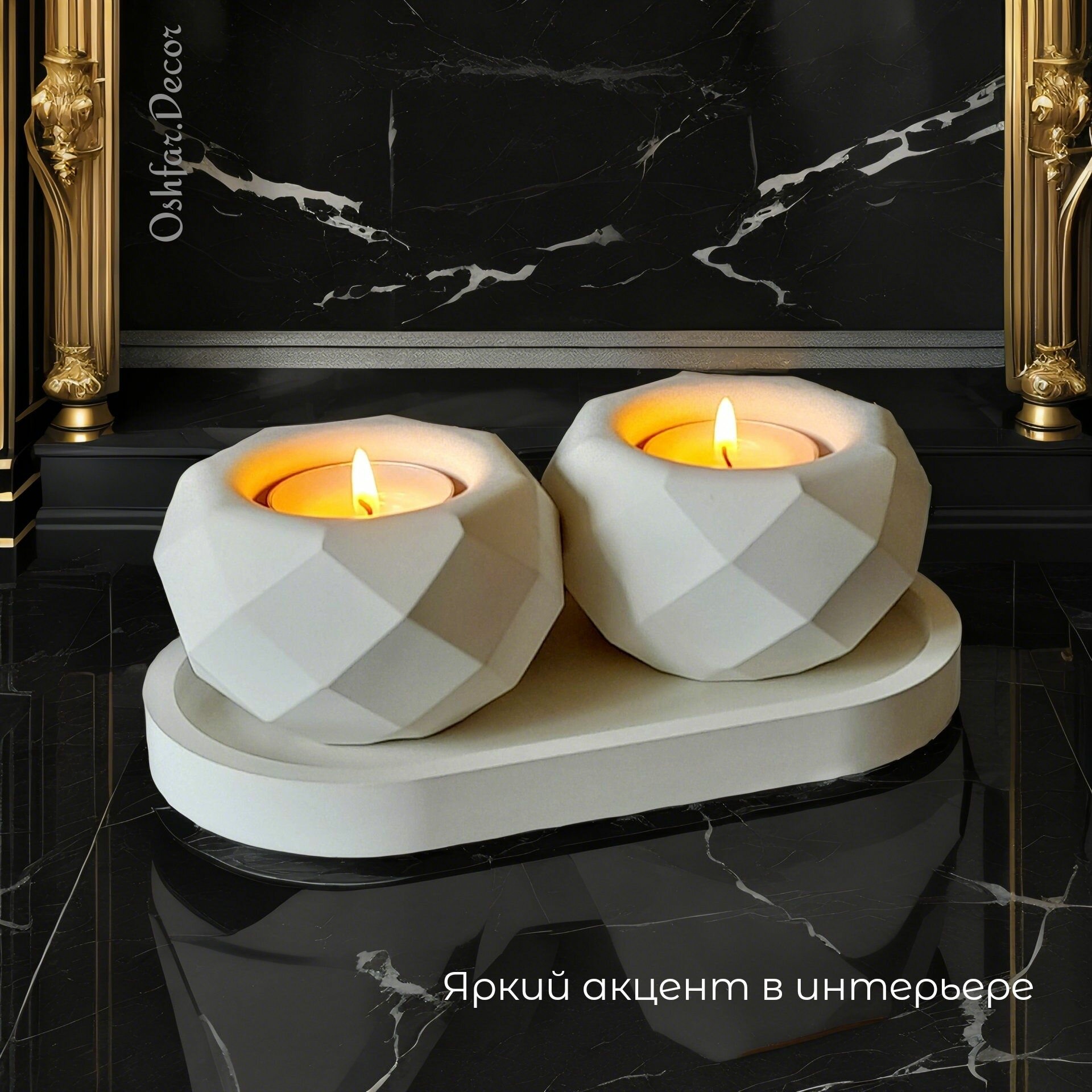 Подсвечники Column из гипса на овальном подносе, набор из 4х предметов. Подарок на новый год. Oshfar Decor