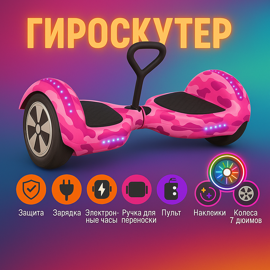 СохранитьГироскутер детский, 7" с поддержкой для рук, защитное снаряжение с дистанционным управлением, камуфляж розовый интересное: